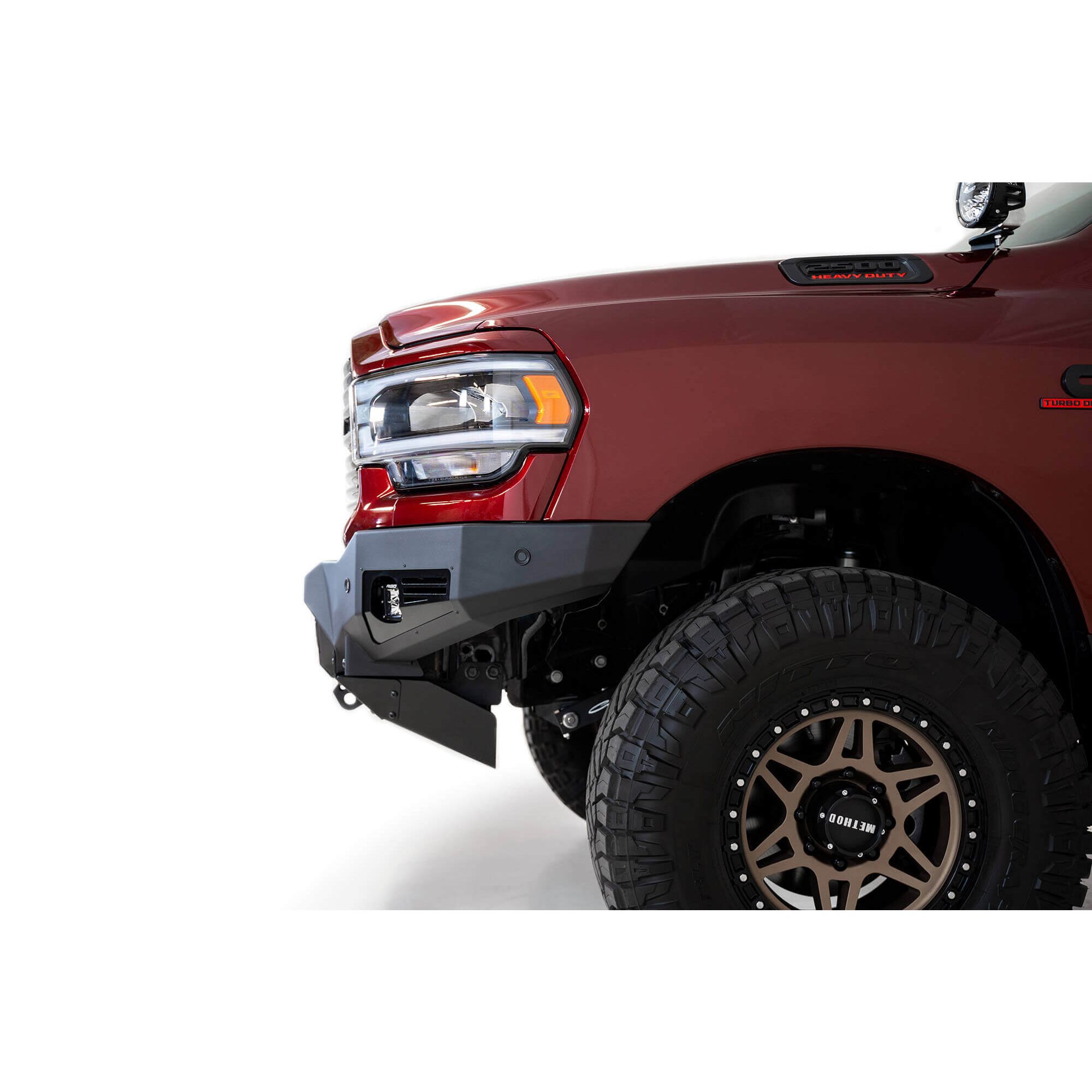 The Addictive Desert Designs Bomber Front Bumper is the slimmest fitting design for your 2020 Ram 2500. A modern plate steel design gives a clean look, while the full 3/16" aluminum skid plate saves on weight. Reinforced mounts for 3/4" D-Rings bolt straight to your frame for unrivaled strength. Three different lighting options are available: 4 Rigid 360 6" light mounts, 3 Baja Designs LP6 light mounts, or two 20" light bar mounts. Each bumper comes with two additional cube light mounts behind the side panels. As always, this bumper is fully bolt-on and made in America.