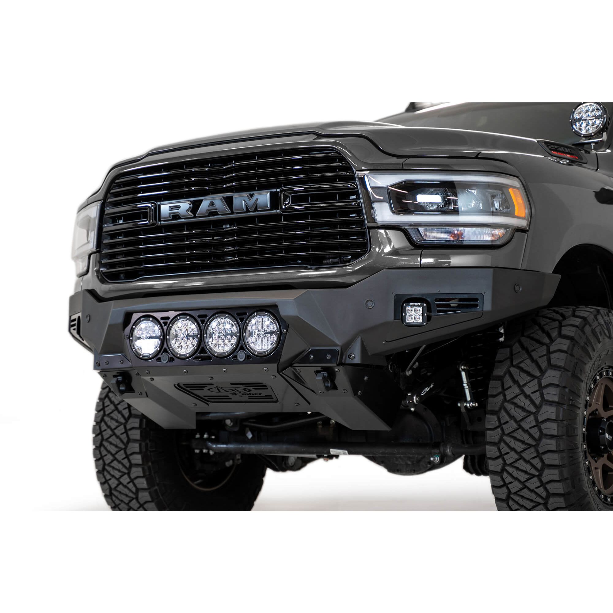 Dodge 2500 / 3500 2019 – up Bomber Front Bumper with Sensors with 4 Rigid 360 6" Mounts with Mounts For 2 Cube Lights in Hammer Black with Satin Black panels