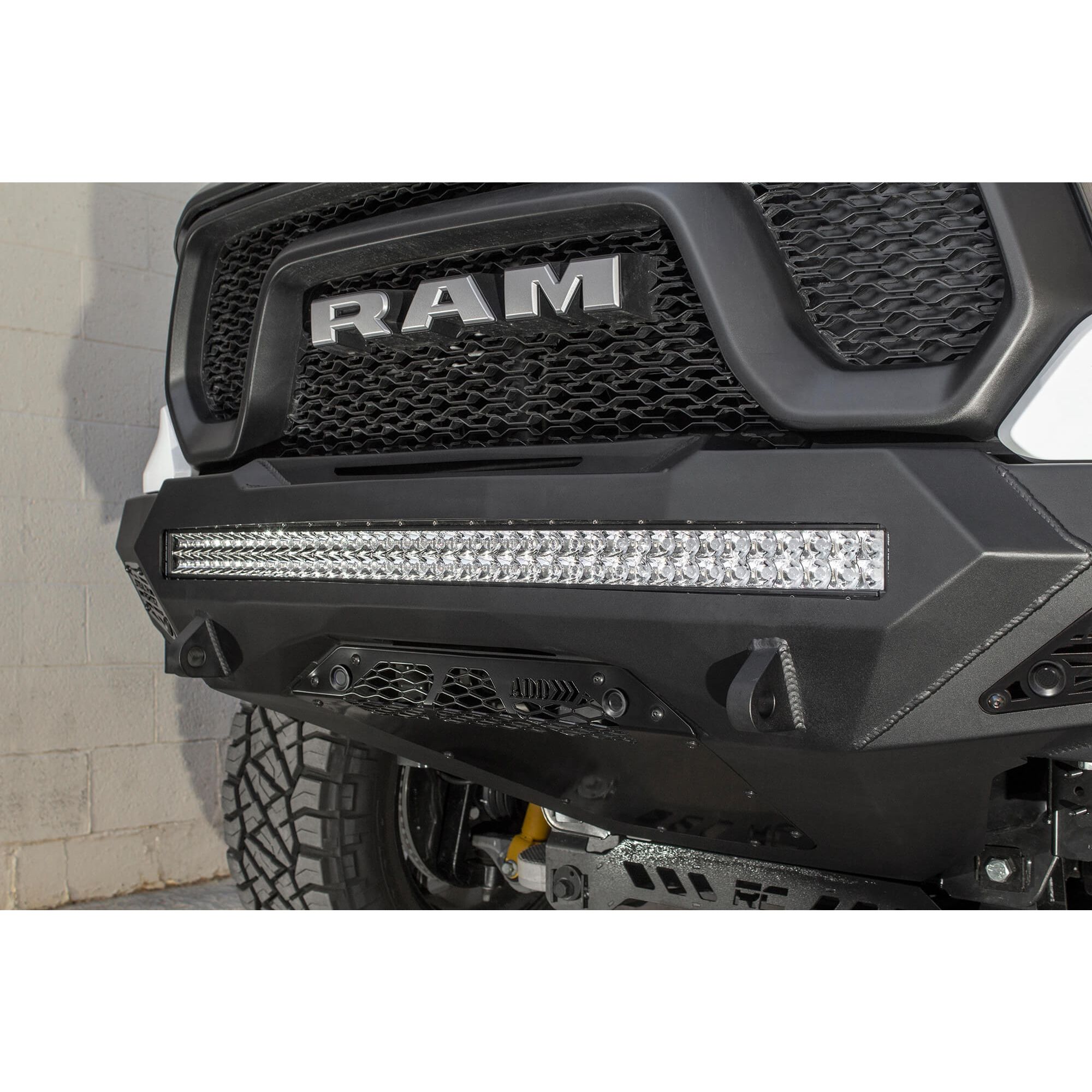 The RAM Rebel has never looked better with the Stealth Fighter front bumper. A radius steel plate design gives your RAM truck added front end protection without all the extra bulk. Matching the RAM Rebel factory body lines, the Stealth Fighter front bumper is a tight fitting steel plate bumper that compliments the RAM's look. A patented universal light mount system allows mounting up to a 40" radius LED or 10 cube lights. Mount any combination of brand, size, and style light to give your RAM front bumper the added lighting that you need. Fully bolt-on means there is no cutting or welding required to install the Stealth Fighter front bumper. Reinforced D-Ring mounts provide your truck with added utility to pull through any tough situation, while optional parking sensor cutouts retain your truck's OEM amenities.