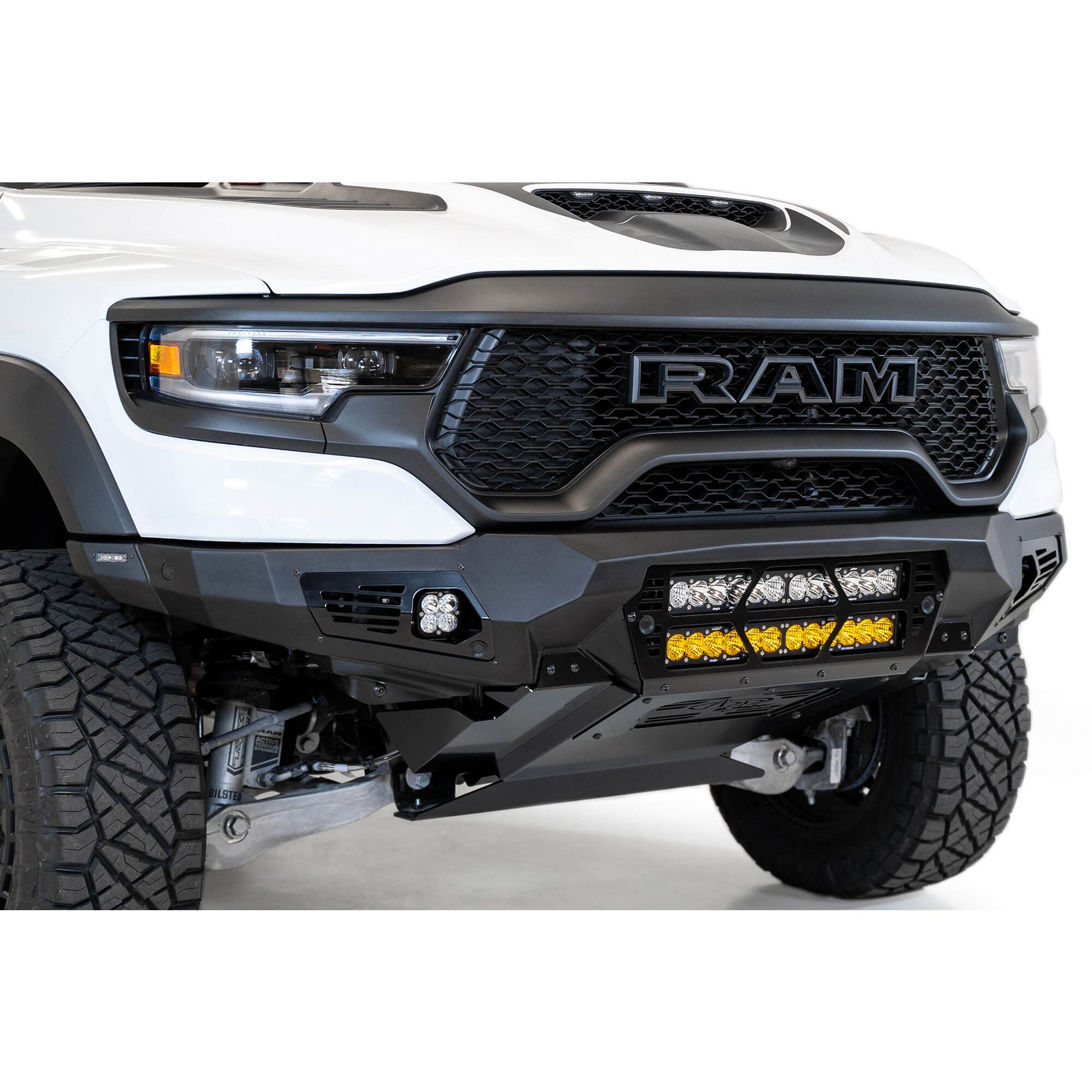 Transform the front end of your Ram TRX with the Addictive Desert Designs Bomber Front Bumper. The modern plate steel design brings aggressive styling while remaining low-profile. The center of the bumper provides inset mounting points for four Rigid 360 6 inch round lights, while each side panel provides a cube light mounting point.