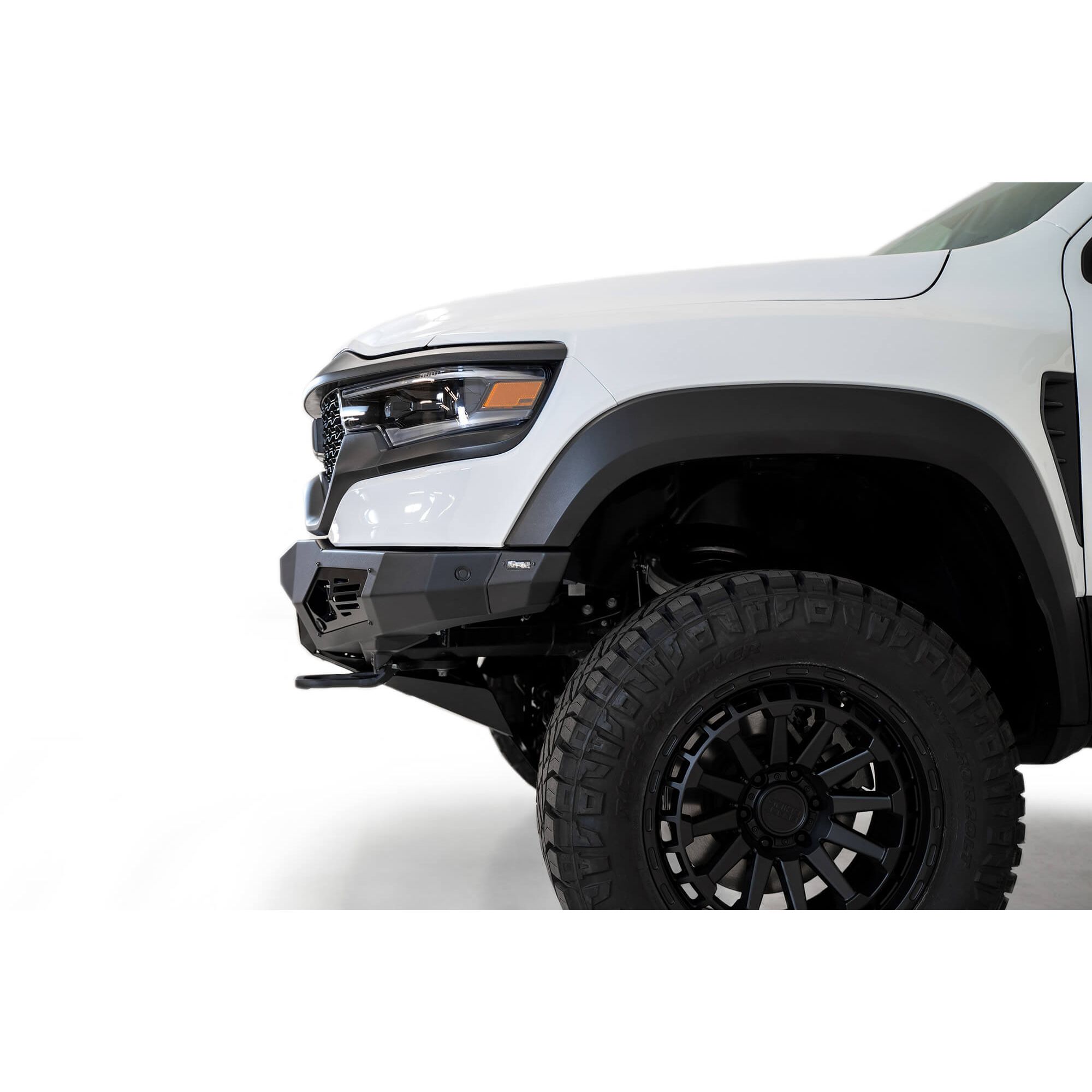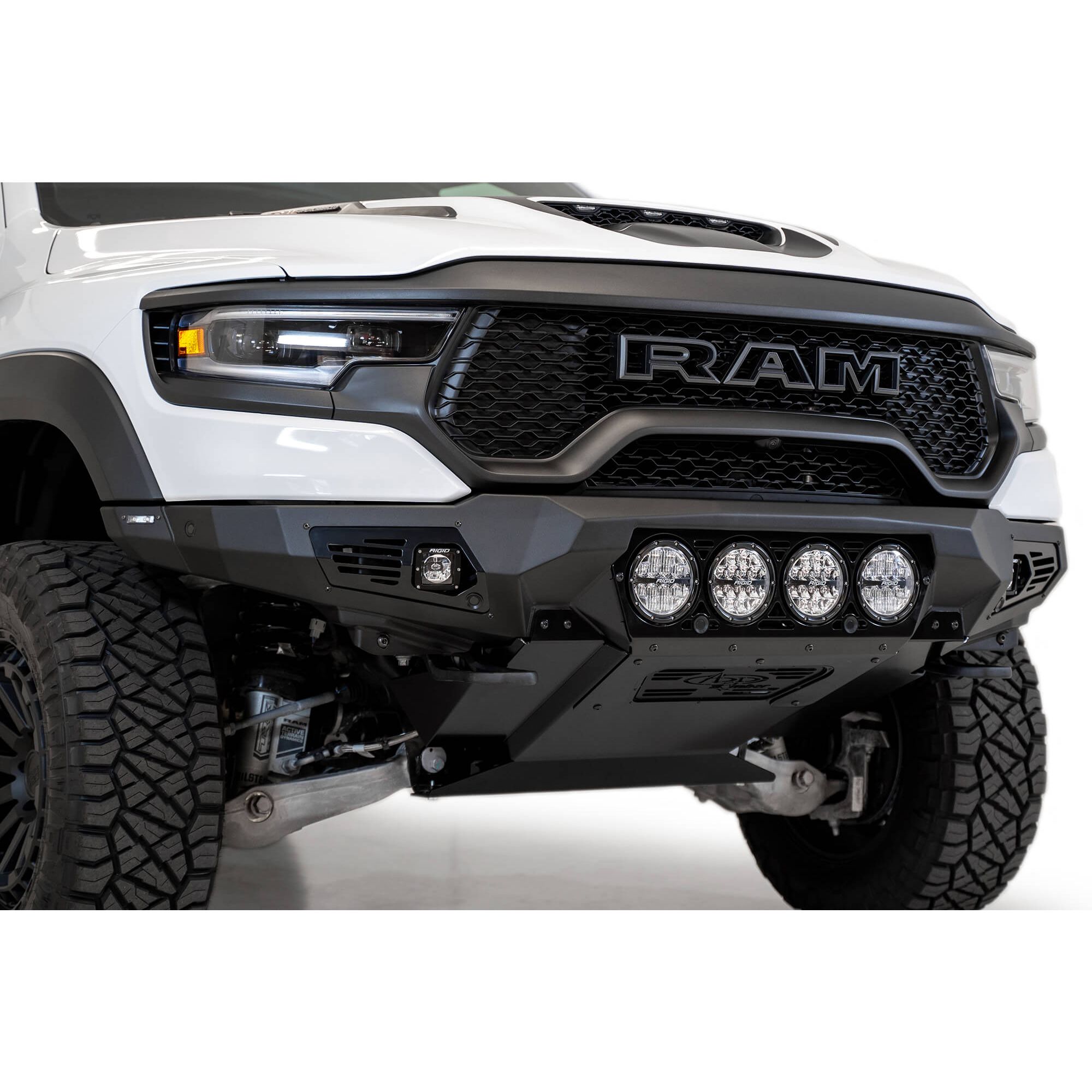 Transform the front end of your Ram TRX with the Addictive Desert Designs Bomber Front Bumper. The modern plate steel design brings aggressive styling while remaining low-profile. The center of the bumper provides inset mounting points for four Rigid 360 6 inch round lights, while each side panel provides a cube light mounting point.