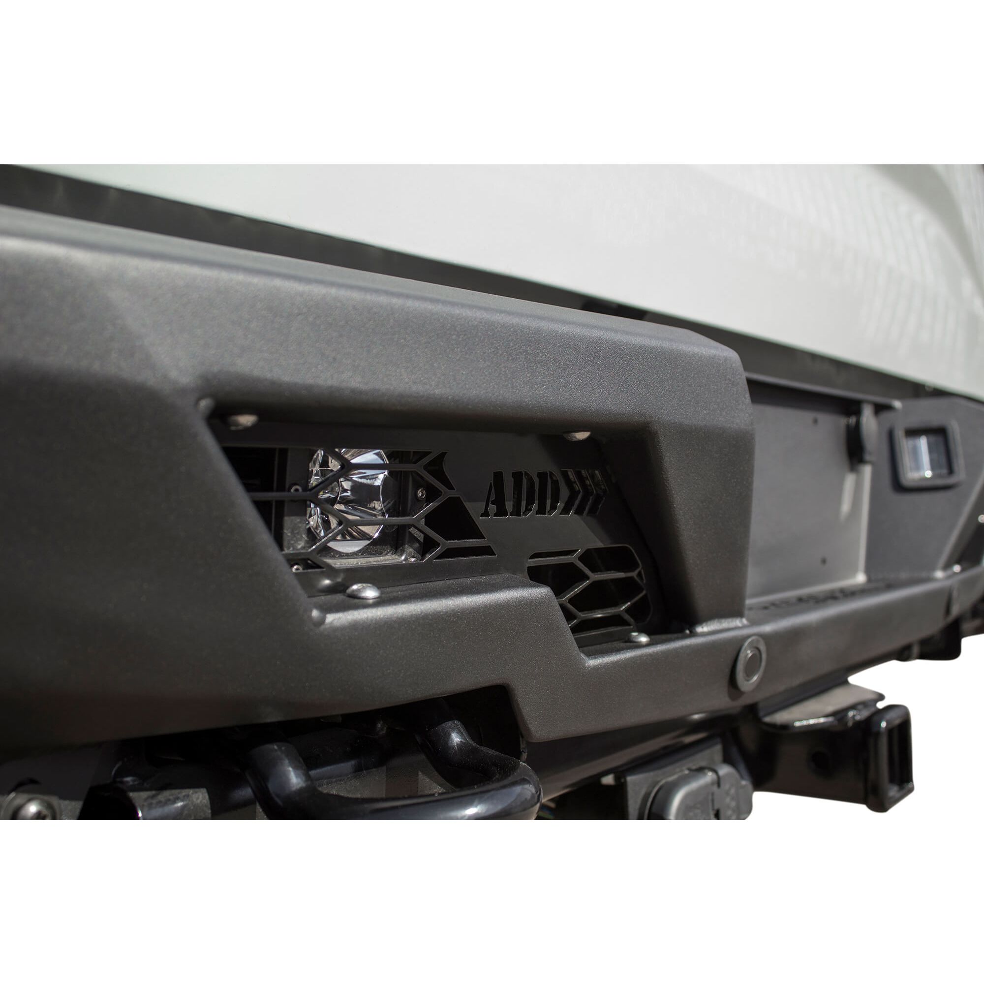 Addictive Desert Designs Stealth Fighter rear bumper is one of the slimmest bumpers you can buy for your Raptor. Measuring the same length from the tailgate as the factory bumper, the Stealth Fighter adds protection to your truck without adding bulk and size. A unique style with sharp angles and recessed paneling follows the factory dovetail look and allows use of factory features such as parking sensors, tow hooks, and hitch. The Stealth Fighter comes standard with two rear face cube light mounts to give your truck additional lighting.