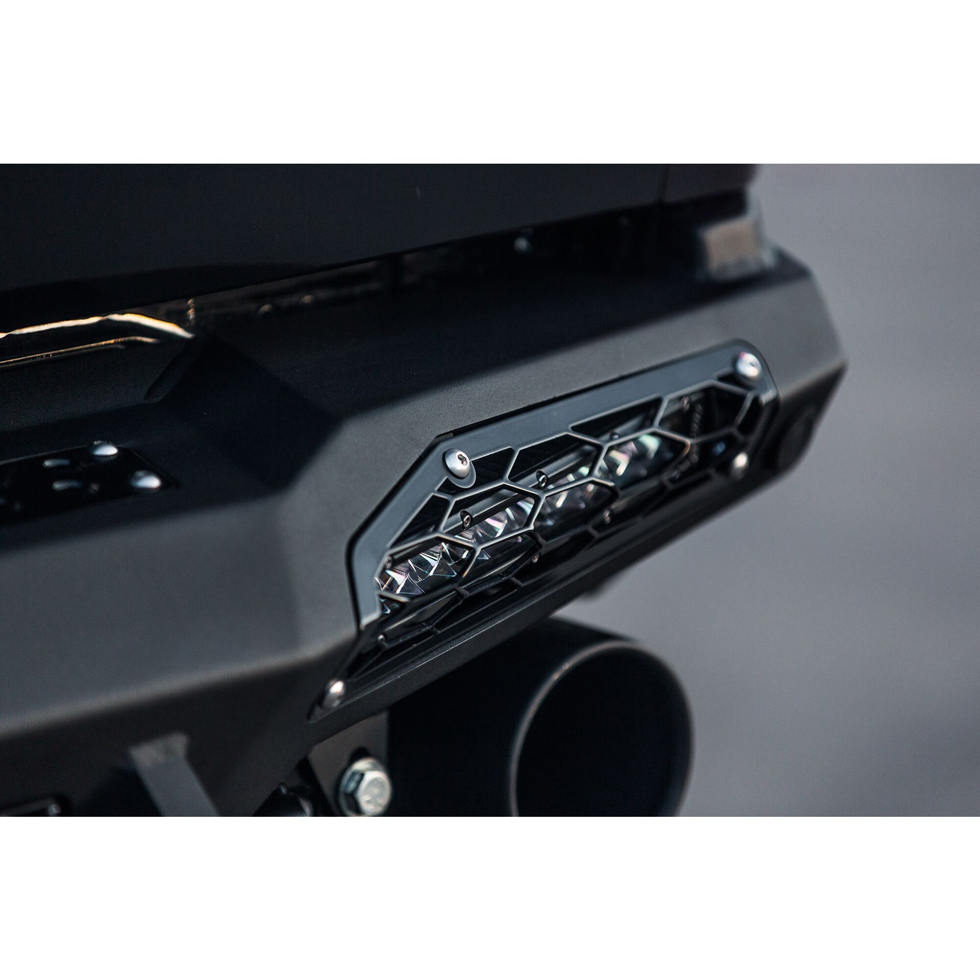 2017 Ford Raptor HoneyBadger Rear Bumper with Tow Hooks and BACKUP SENSORS with 10" SR LED light bar mounts and Dually mounts in Hammer Black with Satin Black panels.