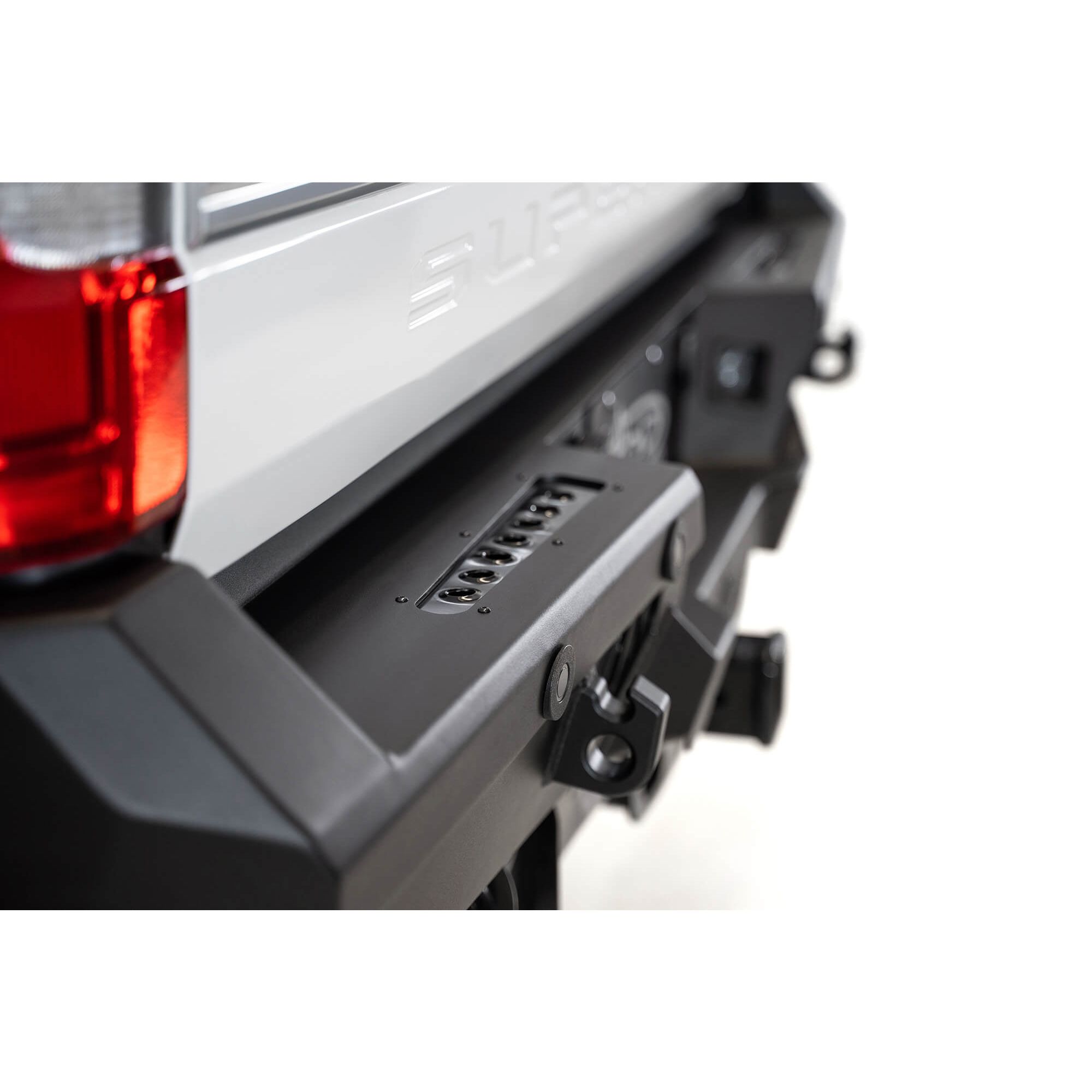 Ford Super Duty Bomber HD Rear Bumper with backup sensors, set up for cube lights in Hammer Black with Satin Black panels