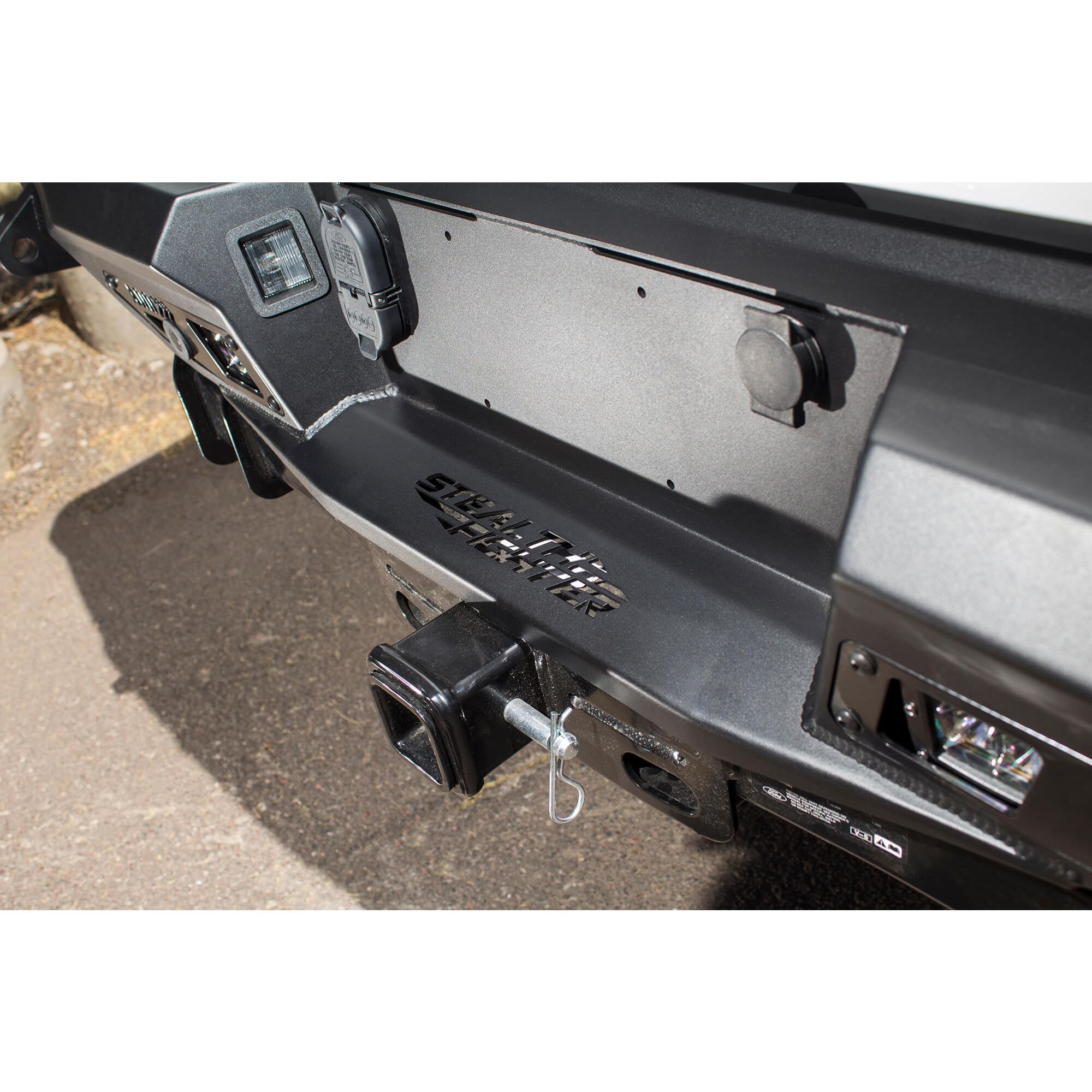 Ford Super Duty Stealth Fighter Rear Bumper set up for duallys with back up sensor holes cut in panels in Hammer Black with Satin Black panels