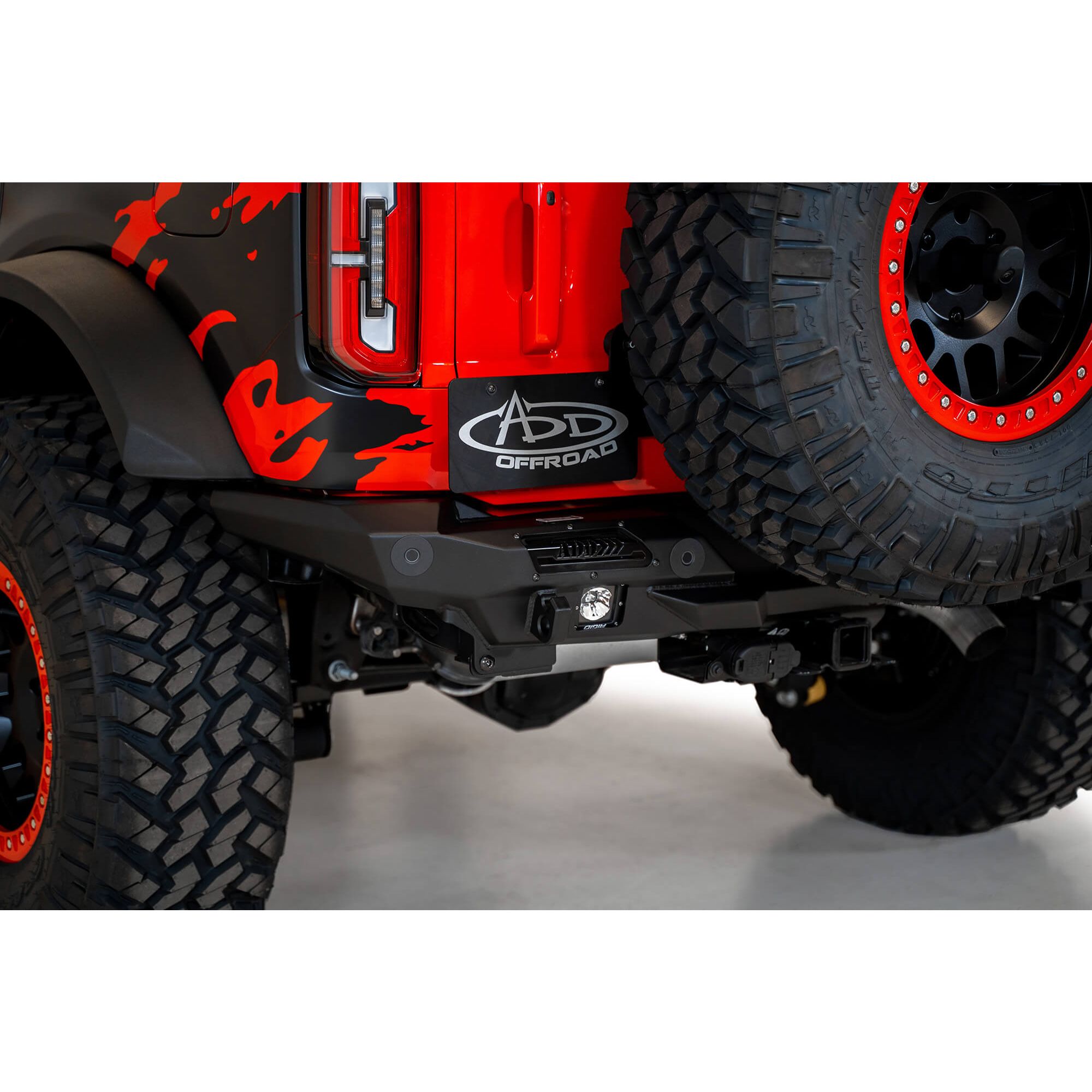 Ford Bronco 2021 – Up Stealth Fighter Rear Bumper with D-Rings with Mounts for 2 Cube Lights in Hammer Black with Satin Black panels