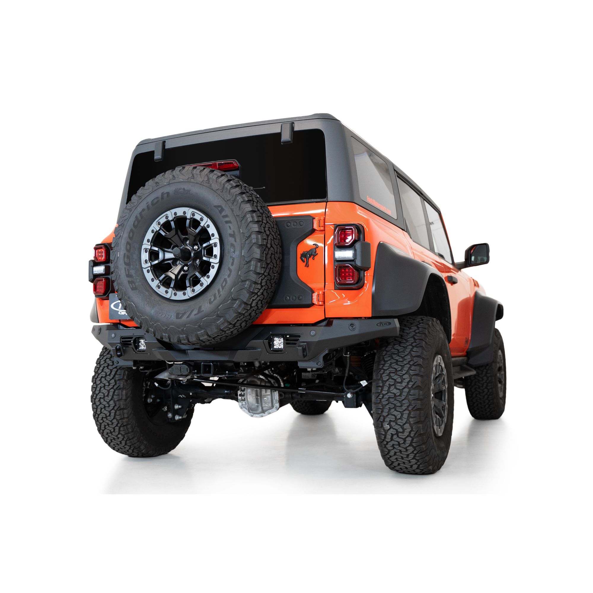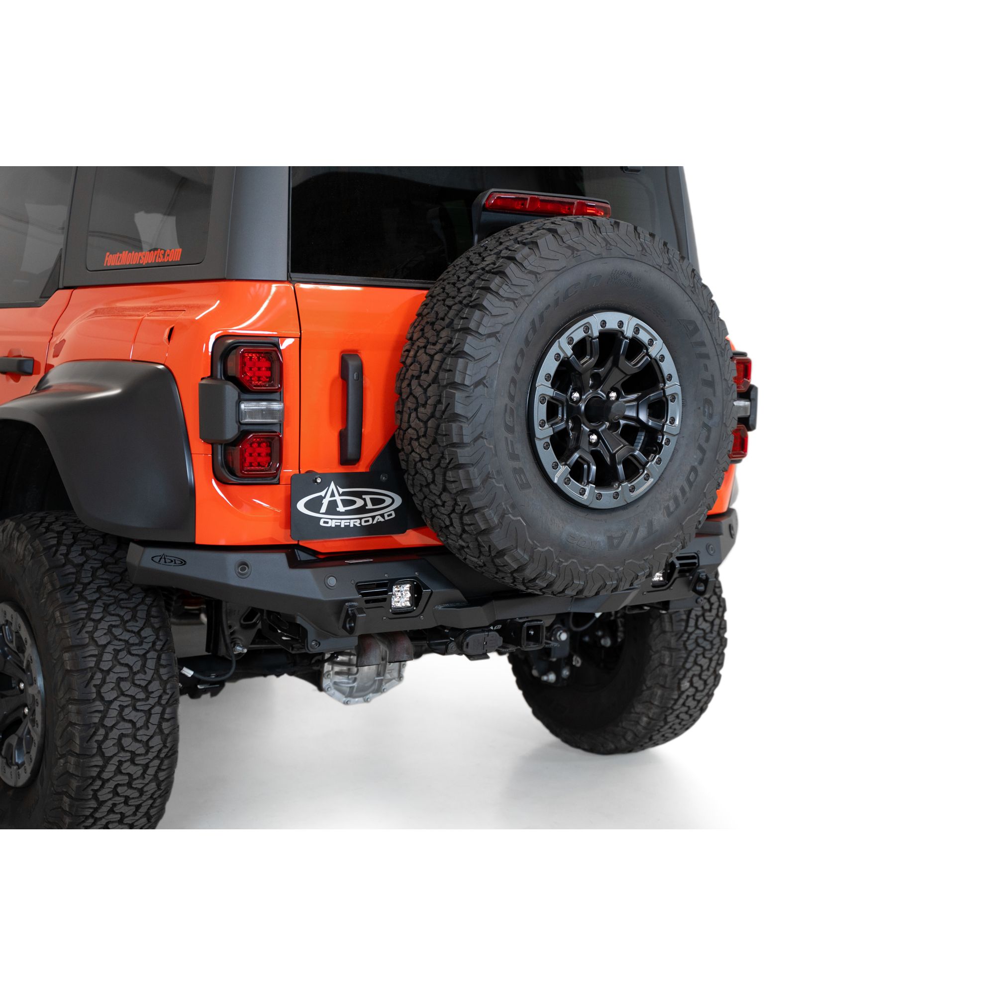 ADD Offroad's Bomber Rear Bumper for the Bronco Raptor is a low-profile and slim-fitting bumper. The Bomber is constructed of modern plate steel, with a hammer black powder coat finish, and lightweight aluminum alloy panels with a satin black powder coat finish. There are 2 universal mounting points for cube lights towards both ends of the bumper that can provide supplemental lighting at the rear of the truck.