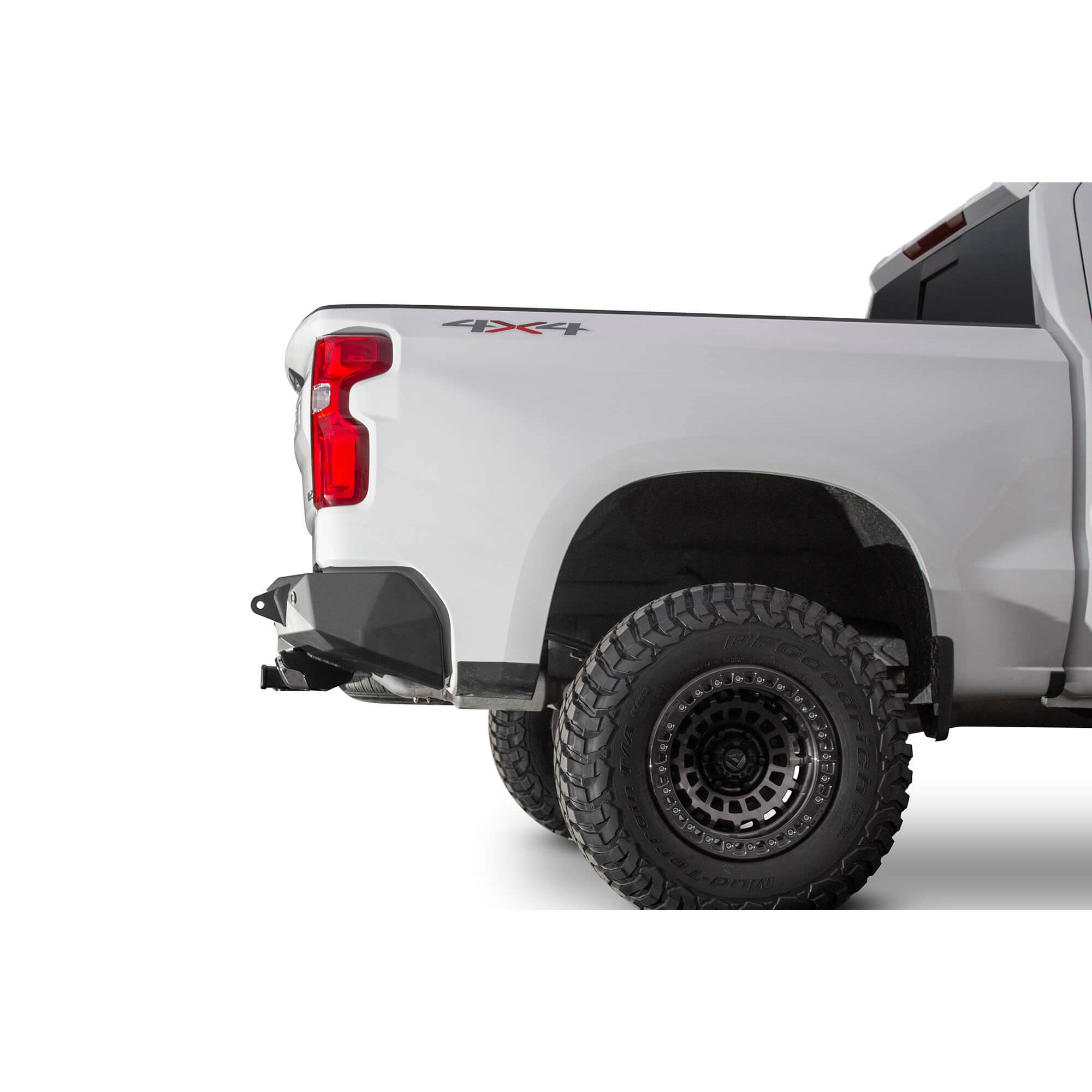 Upgrade your Chevy/GMC 1500 rear bumper with the Stealth Fighter plate steel bumper. The unique styling transforms the look of your truck while retaining the utility of your factory tow hitch and trailer plug. Two rear facing cube light mounts provide your Silverado/Sierra with additional lighting and optional backup sensor cutouts retain your truck's OEM utility. D-Ring mounts have been reinforced so your truck isn't left stranded in a crucial situation. Fully bolt-on means that no cutting or welding is required for installation.