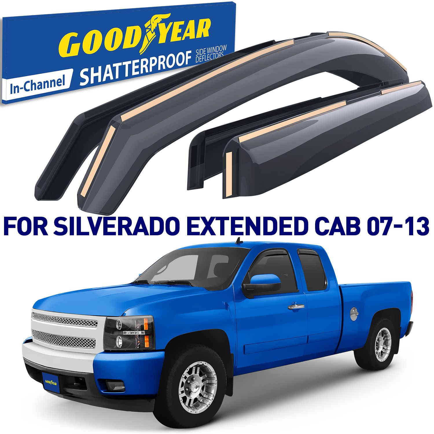 – Car wash friendly. PROVIDES A CUSTOM FIT: – Chevy Silverado 2007-2013 Extended Cab. PACKAGE INCLUDES: 2 Front deflectors, 2 Rear deflectors, Plastic blade, Degrease wipes, Installation instructions, Branded Goodyear color box, Protective shipping box. 100% MONEY BACK GUARANTEE ensures this will be your best bet for a pleasing no-risk purchase. Many customers love these Goodyear Window Guards so much they return to buy more. This makes a much appreciated gift for friends, family, and co-workers.