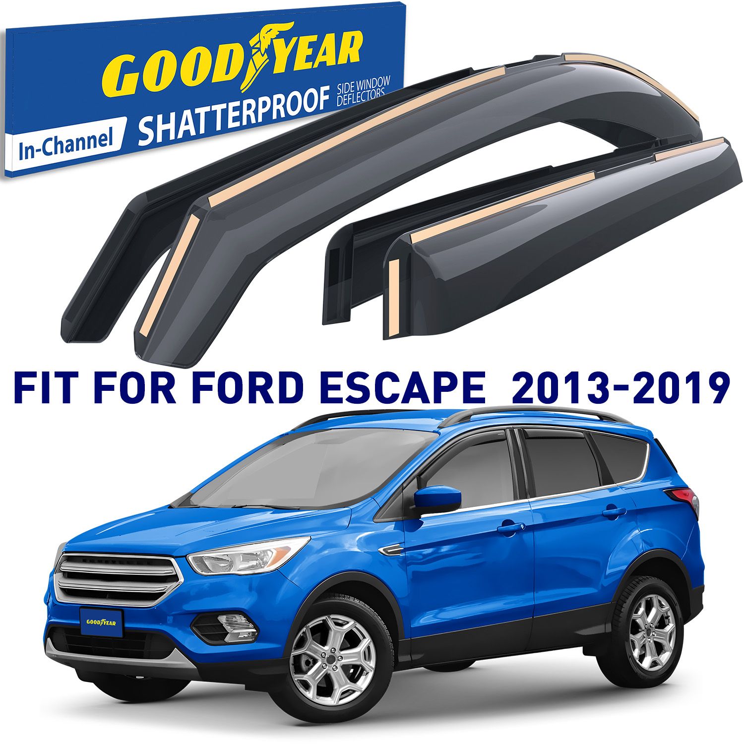 GOODYEAR SIDE WINDOW DEFLECTORS the famous high quality tape-on rain guards that let you drive with your window down in rain, snow, ice and other inclement conditions. PRODUCT FEATURES: – Made from durable, shatterproof polycarbonate – Allows fresh air circulation – Protects from rain and snow – Great for hot days and smokers – Backed by Limited Lifetime Warranty – Windows close tightly – Fits on top mirror mounts, no need to remove – Gives your vehicle a cool upgraded look – Car wash friendly PROVIDES A CUSTOM FIT: – Escape 2013 2014 2015 2016 2017 2018 2019 PACKAGE INCLUDES: 2 Front deflectors 2 Rear deflectors Fastening brackets Metal plate and plastic blade Degrease wipes Installation instructions Branded Goodyear color box Protective shipping box 100% MONEY BACK GUARANTEE ensures this will be your best bet for a pleasing no-risk purchase. Many customers love these Goodyear Window Guards so much they return to buy more. This makes a much appreciated gift for friends, family, and co-workers.