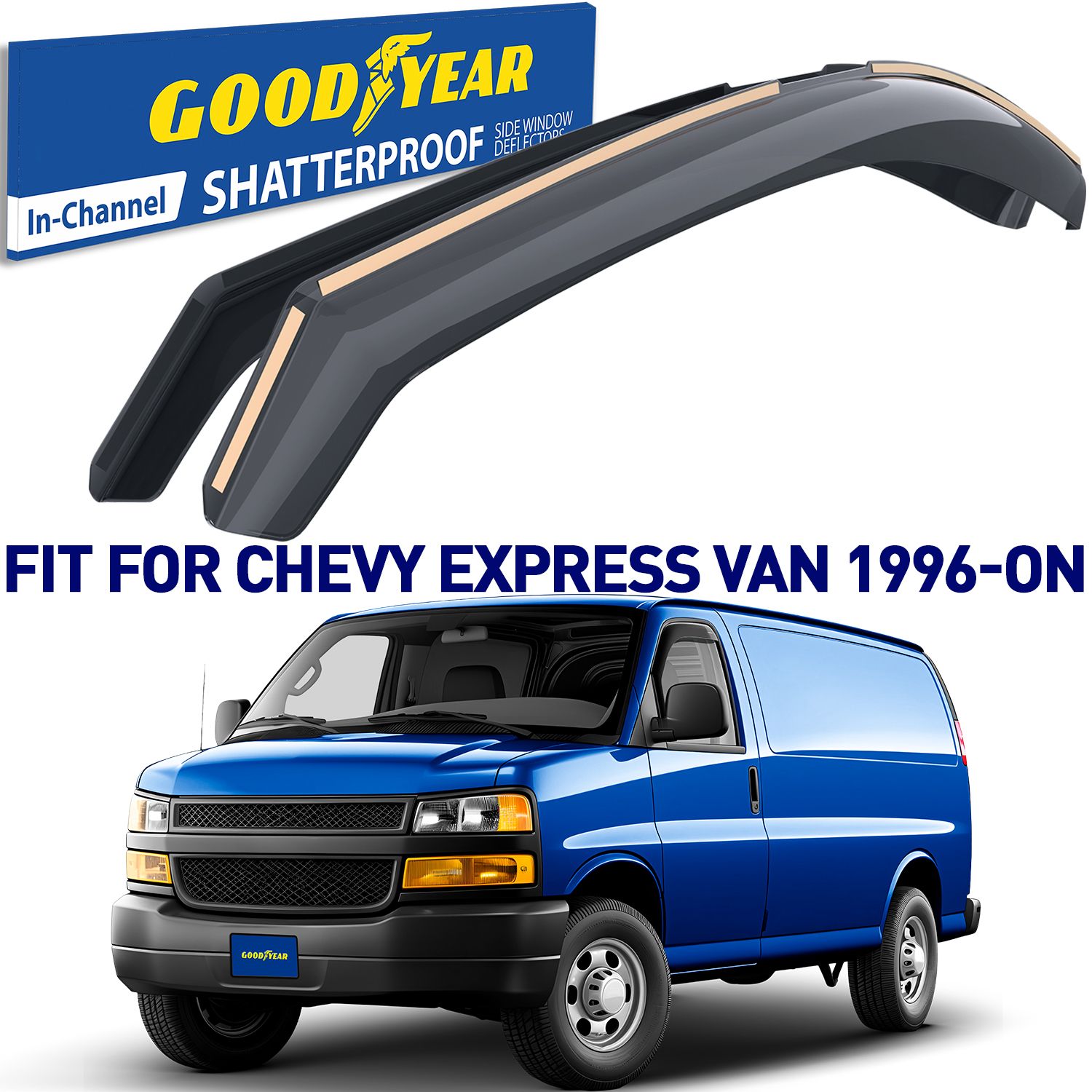 – Car wash friendly. PROVIDES A CUSTOM FIT: – 1996-2014 Chevrolet Express 1500, 1996-2023 Chevrolet Express 2500, 1996-2023 Chevrolet Express 3500, 1996-2014 GMC Savana 1500, 1996-2023 GMC Savana 2500, 1996-2023, GMC Savana 3500, 2009-2023 GMC Savana 4500. PACKAGE INCLUDES: 2 Front deflectors, 2 Rear deflectors, Plastic blade, Degrease wipes, Installation instructions, Branded Goodyear color box, Protective shipping box. 100% MONEY BACK GUARANTEE ensures this will be your best bet for a pleasing no-risk purchase. Many customers love these Goodyear Window Guards so much they return to buy more. This makes a much appreciated gift for friends, family, and co-workers.
