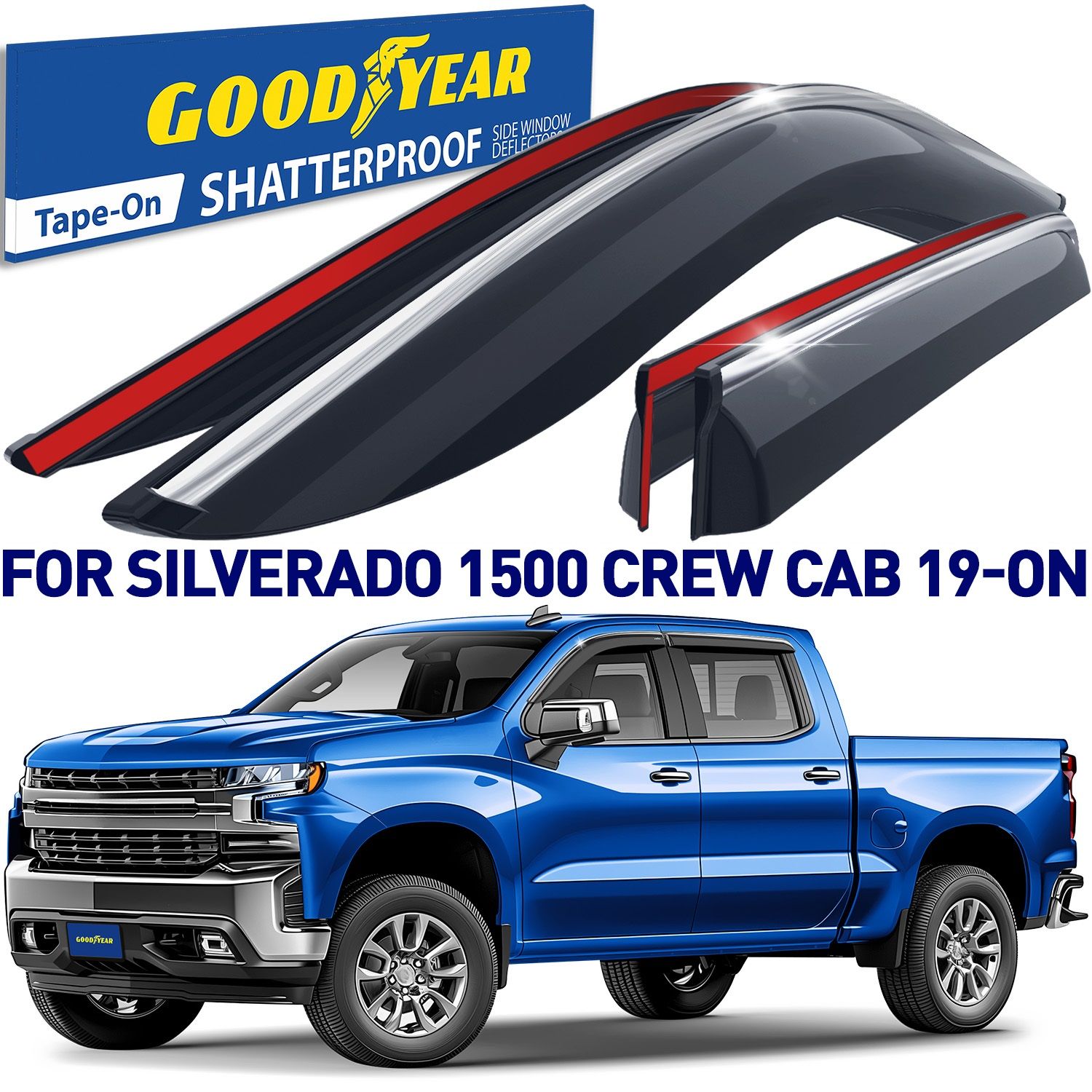Goodyear shatterproof Window Deflectors for Chevrolet (Chevy) Silverado 1500,2500,3500 2019-2024 Crew Cab, Tape-on Rain Guards, Window Visors, Vent Deflector Visor, Car Accessories, 4 pcs. – GY008677