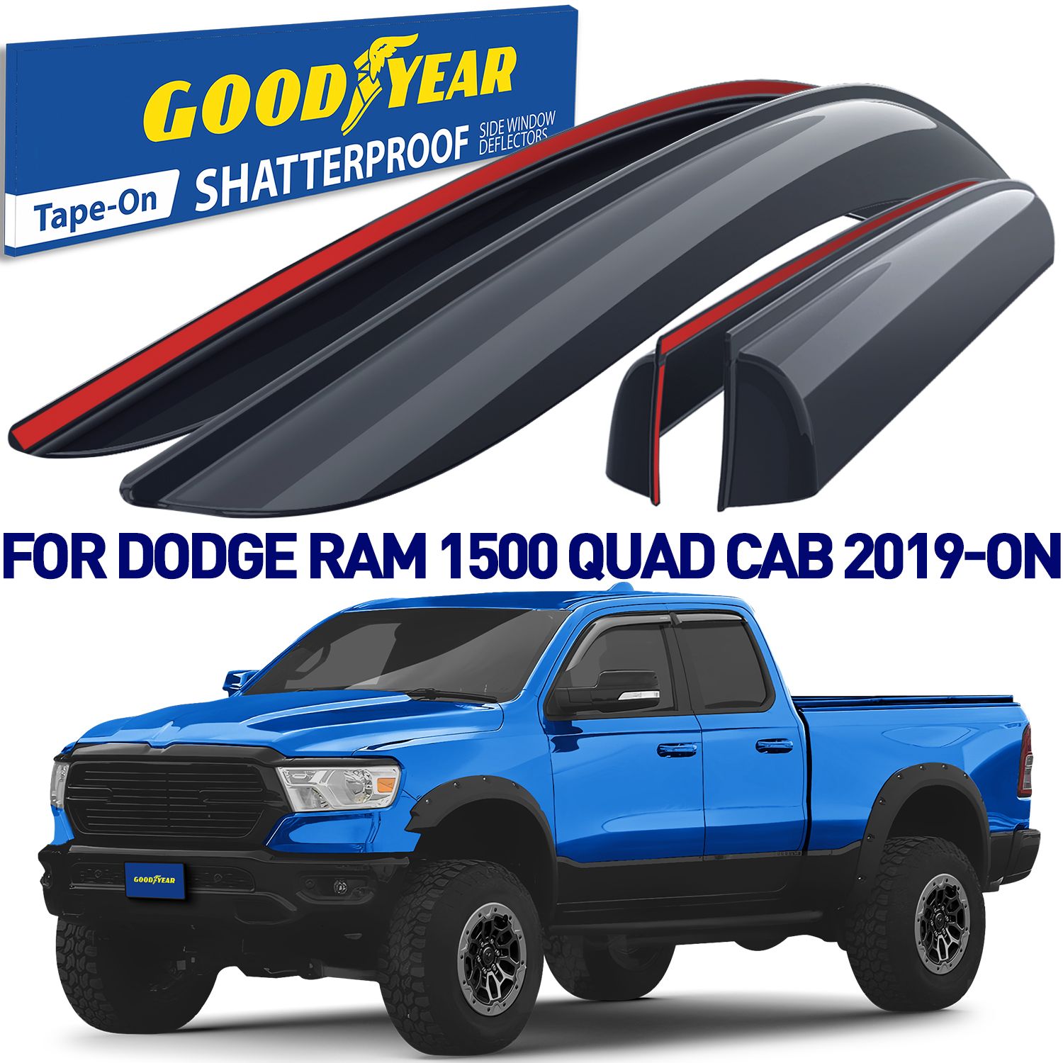 – Car wash friendly. PROVIDES A CUSTOM FIT: – Dodge RAM 1500 2019-2021 Quad Cab, – RAM 1500 2019-2021 Quad Cab. PACKAGE INCLUDES: 2 Front deflectors with 3M VHB tape applied, 2 Rear deflectors with 3M VHB tape applied, 2 Degrease wipes, Installation instructions, Branded Goodyear color box, Protective shipping box. 100% MONEY BACK GUARANTEE ensures this will be your best bet for a pleasing no-risk purchase. Many customers love these Goodyear Window Guards so much they return to buy more. This makes a much appreciated gift for friends, family, and co-workers.