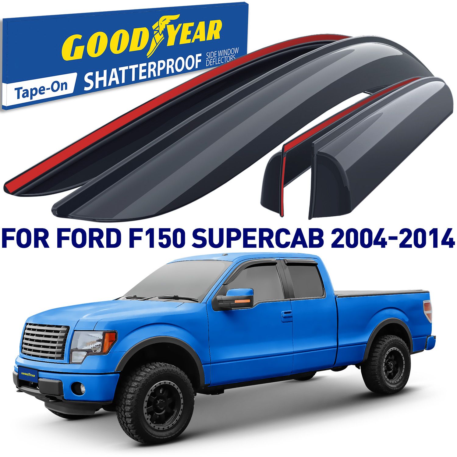 – Car wash friendly. PROVIDES A CUSTOM FIT: – Ford F-150 (F150) 2004-2014 SuperCab. PACKAGE INCLUDES: 2 Front deflectors with 3M VHB tape applied, 2 Rear deflectors with 3M VHB tape applied, 2 Degrease wipes, Installation instructions, Branded Goodyear color box, Protective shipping box. 100% MONEY BACK GUARANTEE ensures this will be your best bet for a pleasing no-risk purchase. Many customers love these Goodyear Window Guards so much they return to buy more. This makes a much appreciated gift for friends, family, and co-workers.