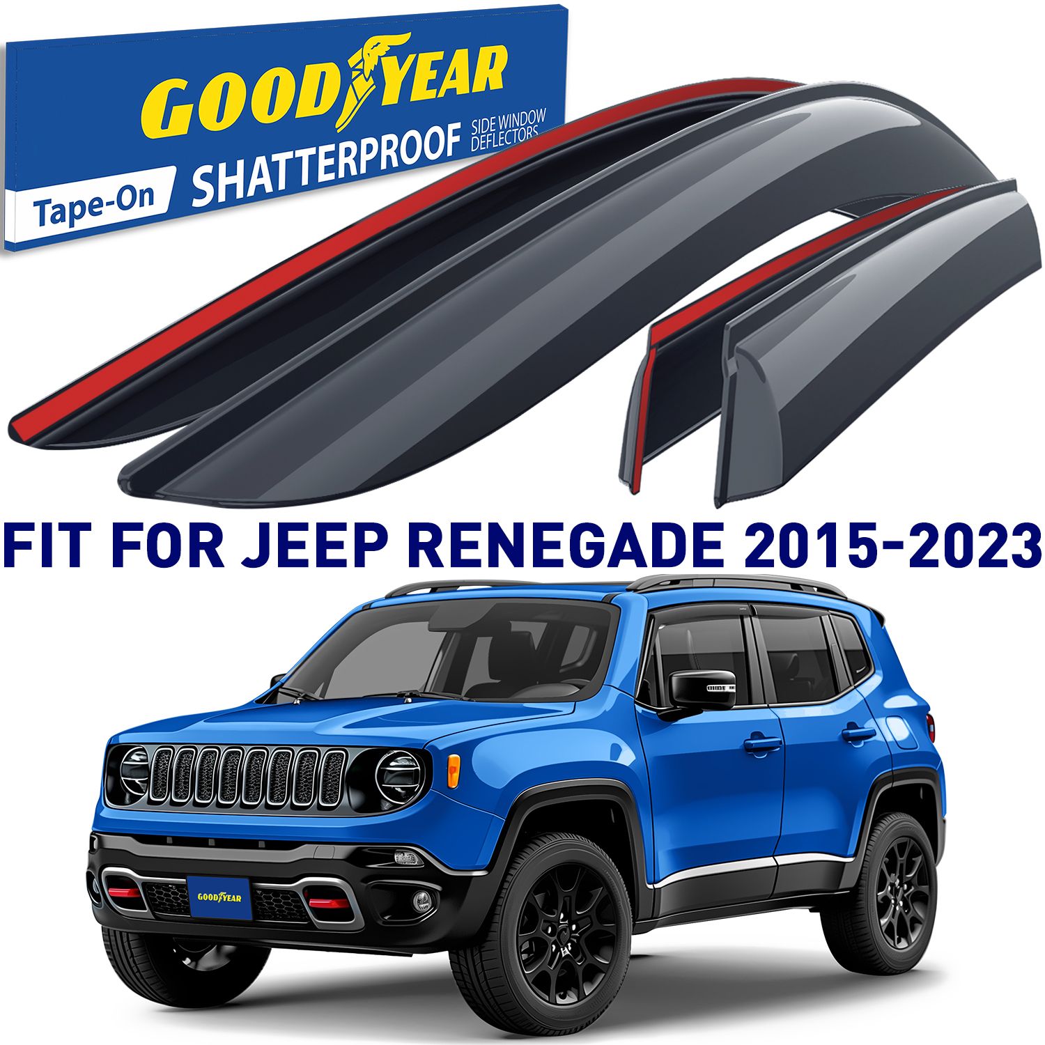 GOODYEAR SIDE WINDOW DEFLECTORS the famous high quality tape-on rain guards that let you drive with your window down in rain, snow, ice and other inclement conditions. PRODUCT FEATURES: – Made from durable, shatterproof polycarbonate – Allows fresh air circulation – Protects from rain and snow – Great for hot days and smokers – Backed by Limited Lifetime Warranty – Windows close tightly – Fits on top mirror mounts, no need to remove – Gives your vehicle a cool upgraded look – Car wash friendly PROVIDES A CUSTOM FIT: – Jeep Renegade 2015 2016 2017 2018 2019 2020 2021 PACKAGE INCLUDES: 2 Front deflectors with 3M VHB tape applied 2 Rear deflectors with 3M VHB tape applied 2 Degrease wipes Installation instructions Branded Goodyear color box 100% MONEY BACK GUARANTEE ensures this will be your best bet for a pleasing no-risk purchase. Many customers love these Goodyear Window Guards so much they return to buy more. This makes a much appreciated gift for friends, family, and co-workers.