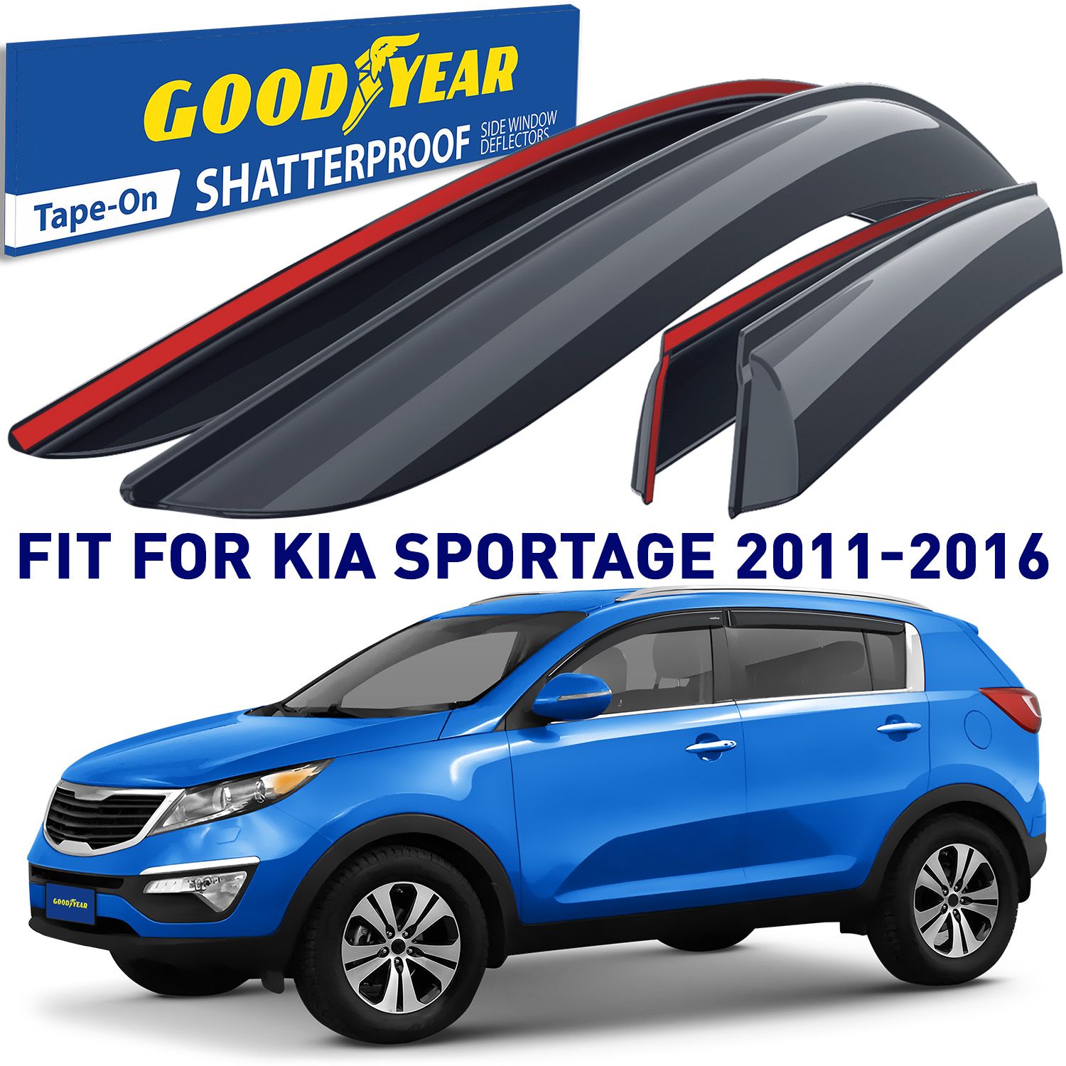 GOODYEAR SIDE WINDOW DEFLECTORS the famous high quality tape-on rain guards that let you drive with your window down in rain, snow, ice and other inclement conditions. PRODUCT FEATURES: – Made from durable, shatterproof polycarbonate – Allows fresh air circulation – Protects from rain and snow – Great for hot days and smokers – Backed by Limited Lifetime Warranty – Windows close tightly – Fits on top mirror mounts, no need to remove – Gives your vehicle a cool upgraded look – Car wash friendly PROVIDES A CUSTOM FIT: – Kia Sportage 2011 2012 2013 2014 2015 2016 PACKAGE INCLUDES: 2 Front deflectors with 3M VHB tape applied 2 Rear deflectors with 3M VHB tape applied 2 Degrease wipes Installation instructions Branded Goodyear color box 100% MONEY BACK GUARANTEE ensures this will be your best bet for a pleasing no-risk purchase. Many customers love these Goodyear Window Guards so much they return to buy more. This makes a much appreciated gift for friends, family, and co-workers.