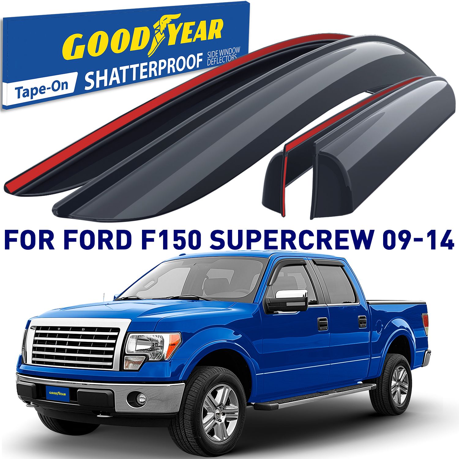 Goodyear Shatterproof Side Window Deflectors for Trucks Ford F-150 2009-2014 SuperCrew Cab, Tape-on Rain Guards, Vent Window Visors, 4 Pieces – GY003110