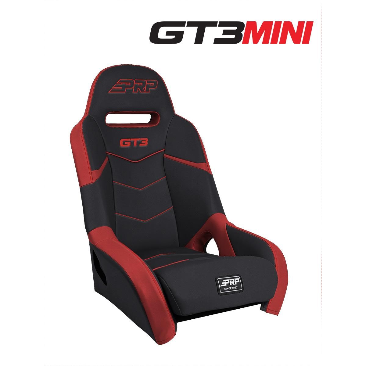 The GT3 Mini takes our best selling GT3 seat, and miniaturizes it for your “young adult” riders. The seat features modern styling, along with the added comfort and containment of a suspension seat. Features include a removable seat cushion, a 5th point harness slot, and modern styling. Additional bands allow you to customize the colors and materials of your seat more than ever! The medium height containment on the sides of the seats keeps young adults secure in the seat when bouncing around rough terrain, while still being easy to get in and out of the vehicle. That containment keeps their body from sliding around in the seat, and allows them to maintain better control on the wheel while driving through rough terrain. So they can drive with confidence that they'll stay secure in the seat no matter what the yard or trails throws at them. The GT3 Mini keeps young adults contained and comfortable with 5? of containment at the hips. Medium level containment on the sides keeps them secure when the ride gets rough, but still makes it easy to get in & out of the vehicle. The vinyl-coated nylon suspension liner and dual-density foam decrease the impact on the body, reducing the fatigue you feel after a long day in the dirt or dunes. The seat is best fit for smaller rider sizes approx 8-13. The seat comes with 4 mounting tabs on the bottom (12"W x 18"D) that you can fabricate to fit almost any vehicle, or we have specific mounts to adapt this seat into the Polaris RZR 200 (mounts sold separately). Seats are sold individually. Made from durable and UV resistant vinyl. Don't forget to grab harnesses! This seat is not compatible with the stock 3pt seat belts in the RZR 200. We also encourage the use of aftermarket harnesses for the increased safety they offer. PRP highly recommends our 4.2 Harness, since it features an auto buckle that is easier for most smaller riders to click in and out of. Proudly Made in the USA. Fitment – Polaris RZR 200 (mounts sold separately). U
