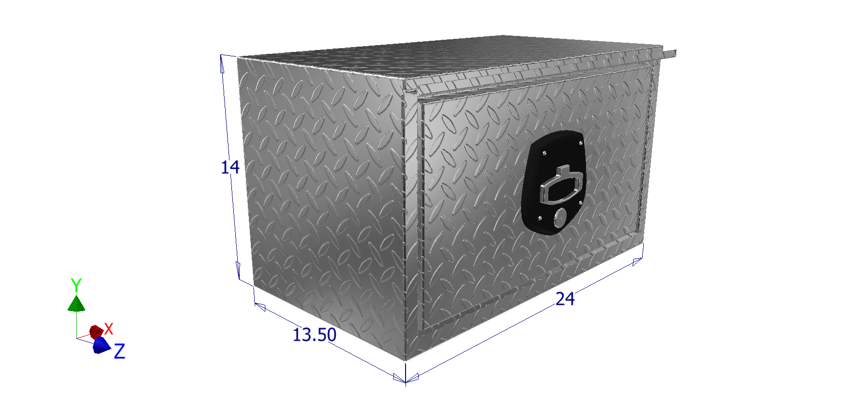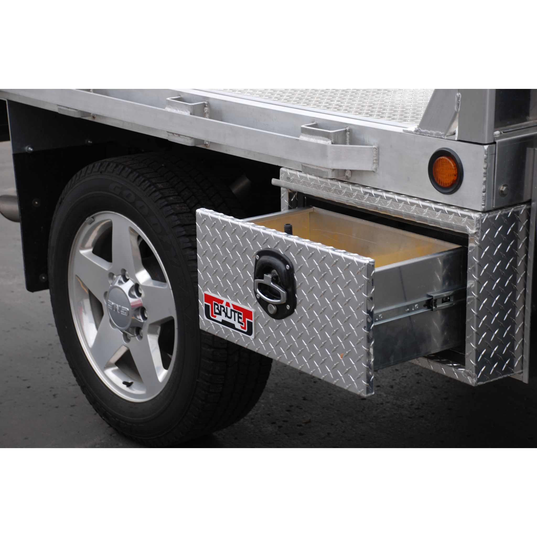 13.5" x 14" x 24" Single Drawer Under Body, .100" Thick Diamond Tread Aluminum Construction; .080" Smooth Aluminum Drawer Interiors; Drawer with Adjustable Dividers; Full Wrap One Piece Body Design; Full HD Aluminum Lock Cover Protection