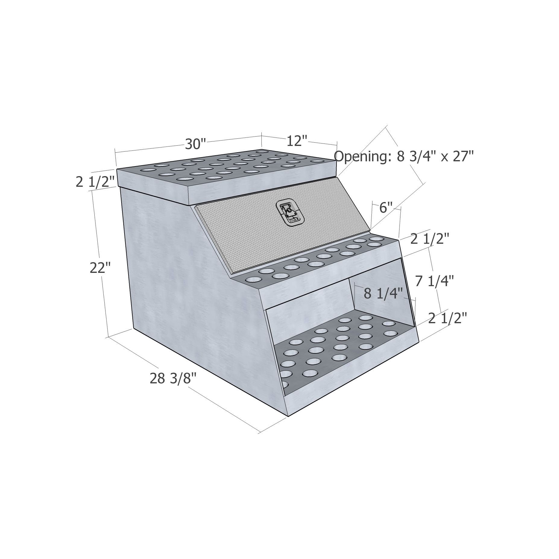 30" x 24" x 28" HD Step Box; .125" Smooth Aluminum Body; .100" Aluminum Diamond Tread Door; .080 Perforated Aluminum Steps; Angle Reinforced Back Corners; Center Reinforced Top Step; Welded Aluminum Construction; Integrated Tool Box Cavity