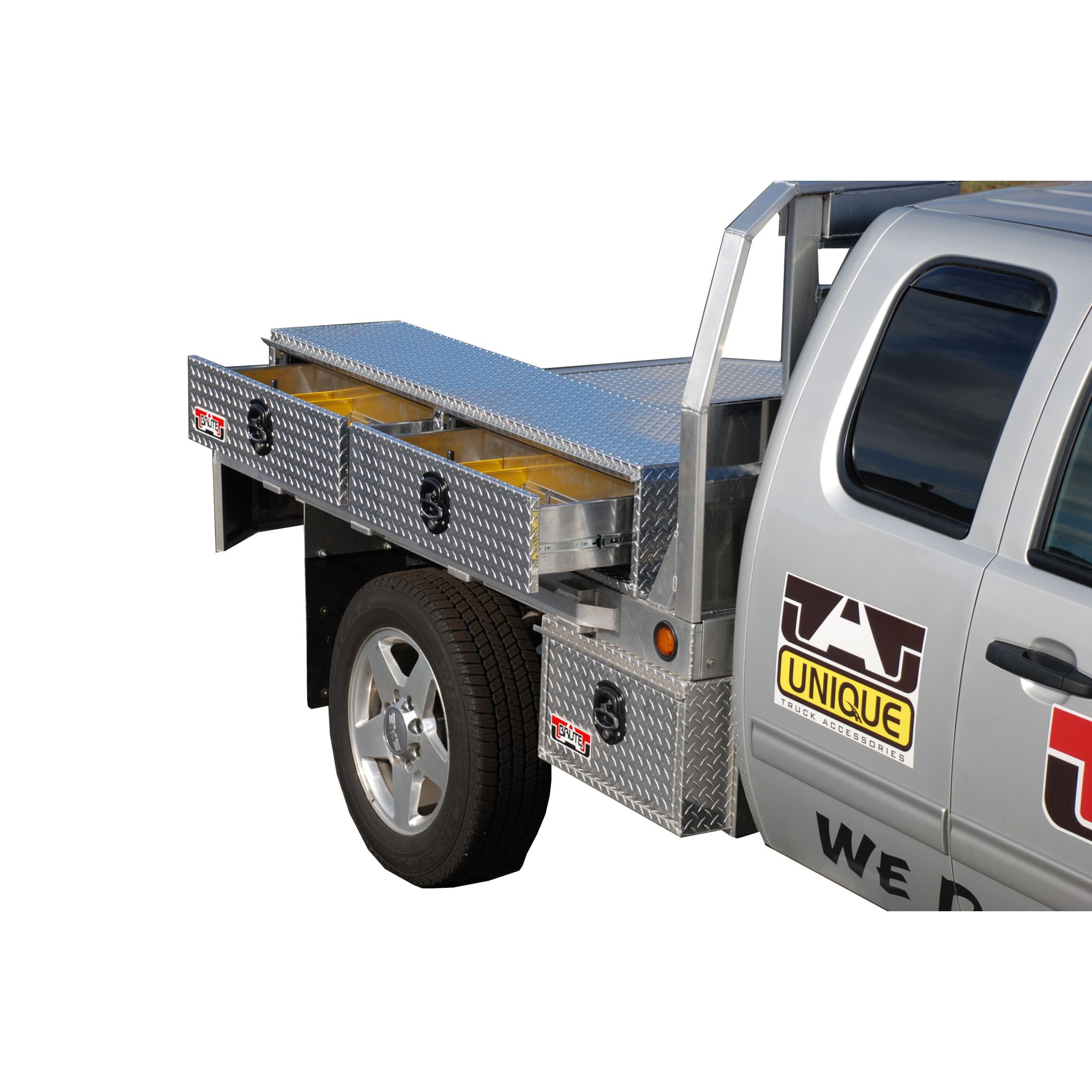 16" x 12" x 72"L Stake Bed Top Sider w/2 drawers; .100" Diamond Tread Aluminum; Welded Gussets; Drawers with Dividers; Full Wrap One Piece Body; Full HD Aluminum Lock Cover; Mounting Hardware Included; Black Text