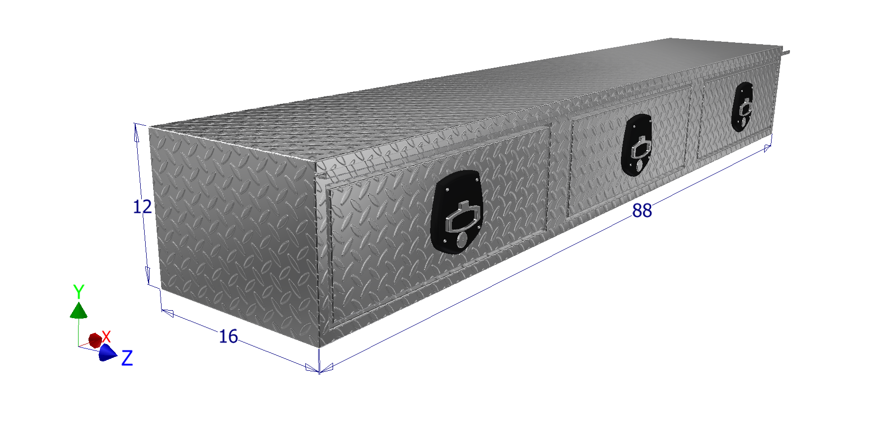 16" x 12" x 88"L Stake Bed Top Sider w/2 drawers; .100" Diamond Tread Aluminum; Welded Gussets; Drawers with Dividers; Full Wrap One Piece Body; Full HD Aluminum Lock Cover; Mounting Hardware Included; Black Text