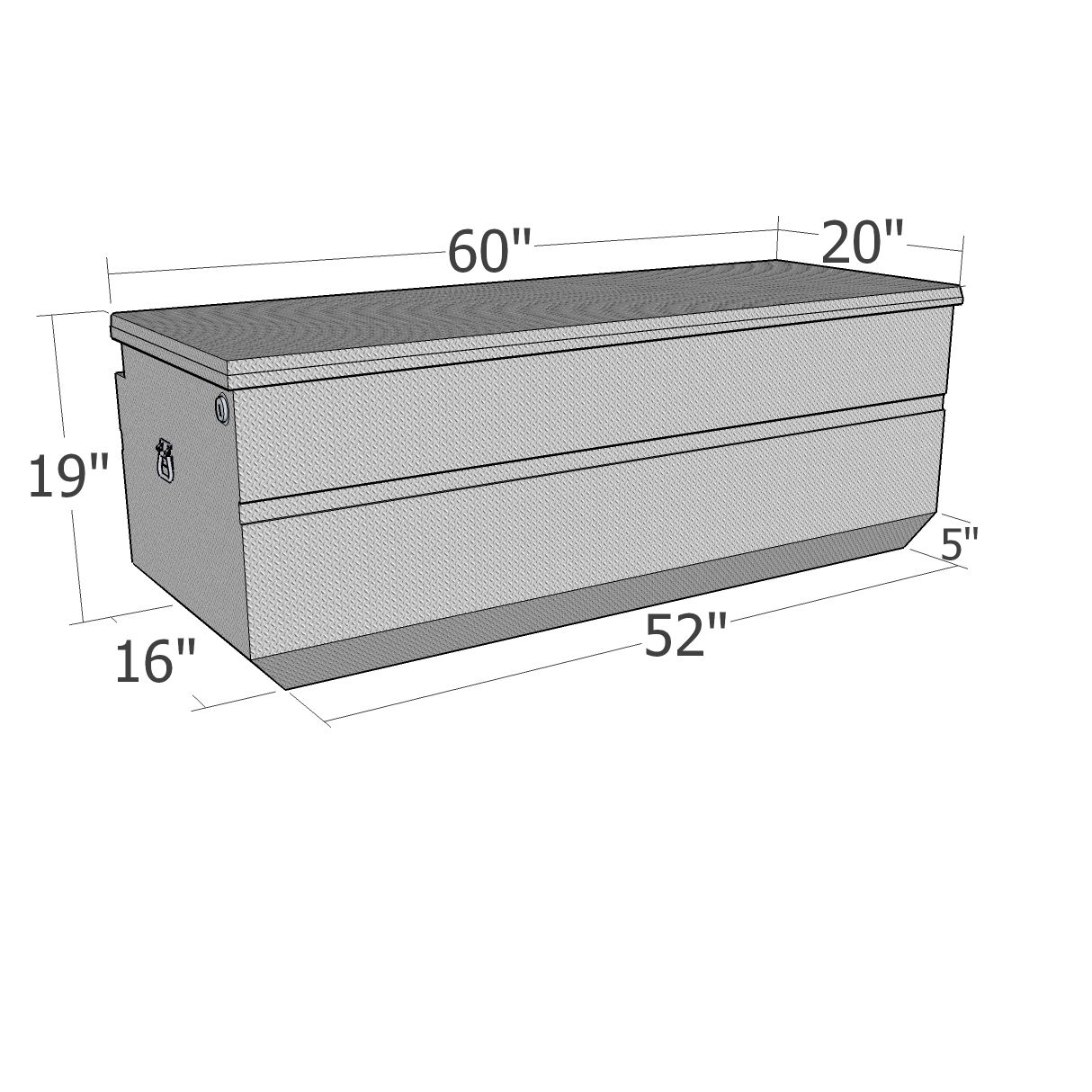 60" Chest – Comm Class; Offset on Rear for 90 Degree Lid Opening; Rubber Seals; Below Side Rails; Full Metal Guards on Gas Props & Hardware; Beveled Reinforced Lid; Push Button Rotary Latch; HD Aluminum Adjustable Tray; Black Texture Coated