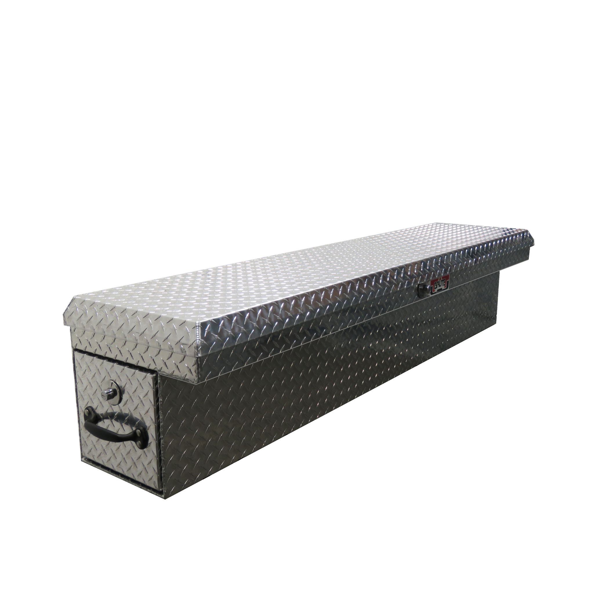 56" LoSiderSafe Side Rail Box; .063" Aluminum Diamond Tread; Top Opening Compartment with Removable Dividers; Rear Bedsafe Roller Drawer with Removable Dividers; Single Touch Safety Plunger Latch on Drawer; Black Texture
