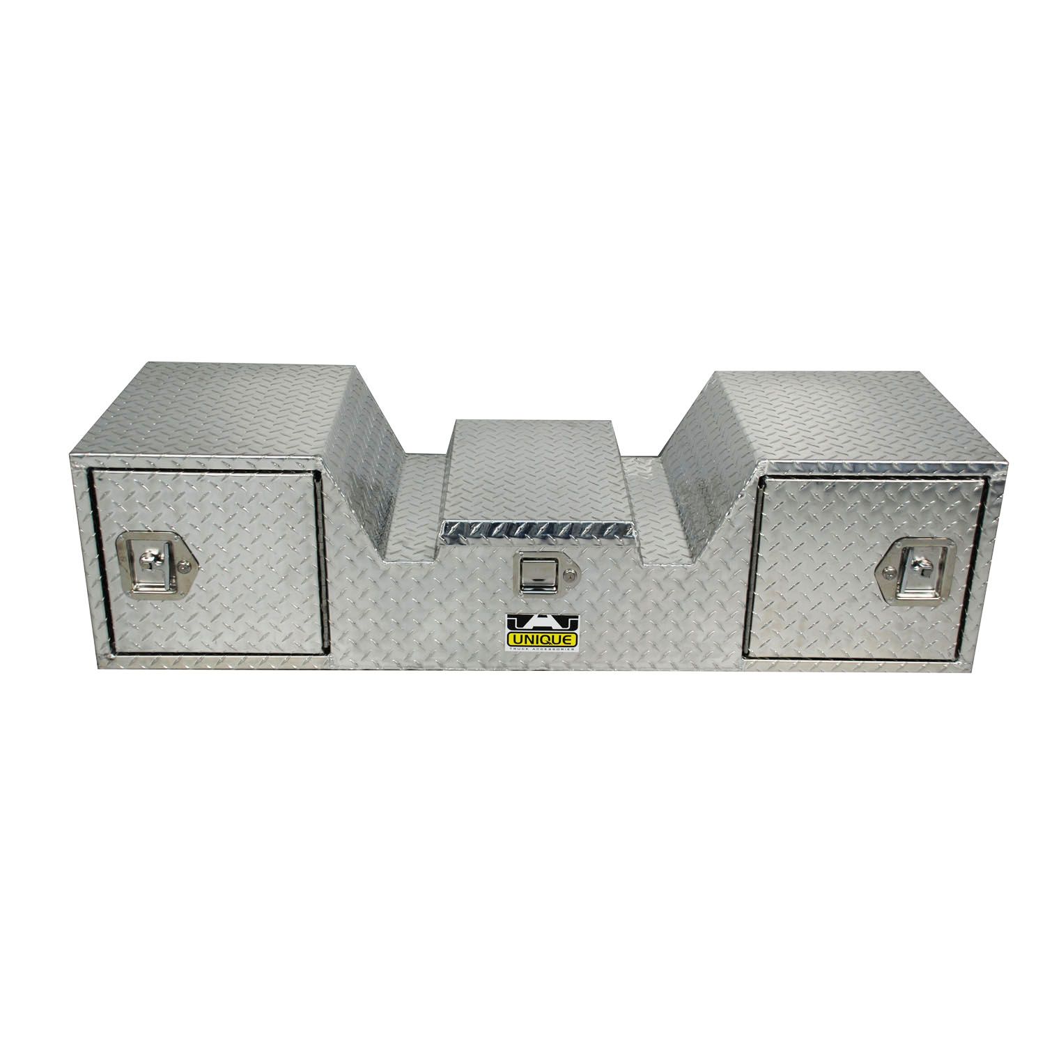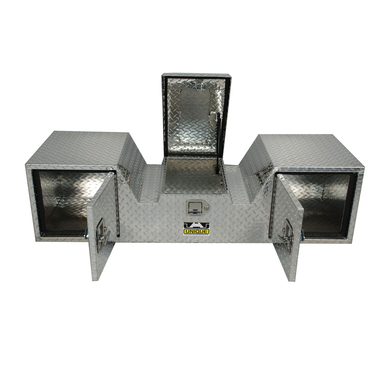 57" V-Shape 5th Wheel RV Box, 1 Lid, 2 Rear Facing Doors; 1 Center Compartment with Lid & Shock; 2 Outer Door Compartments; Easier Access when Hooked up; Locking Paddle and Folding T Handles; Full Rubber Seal; Durable Aluminum Construction