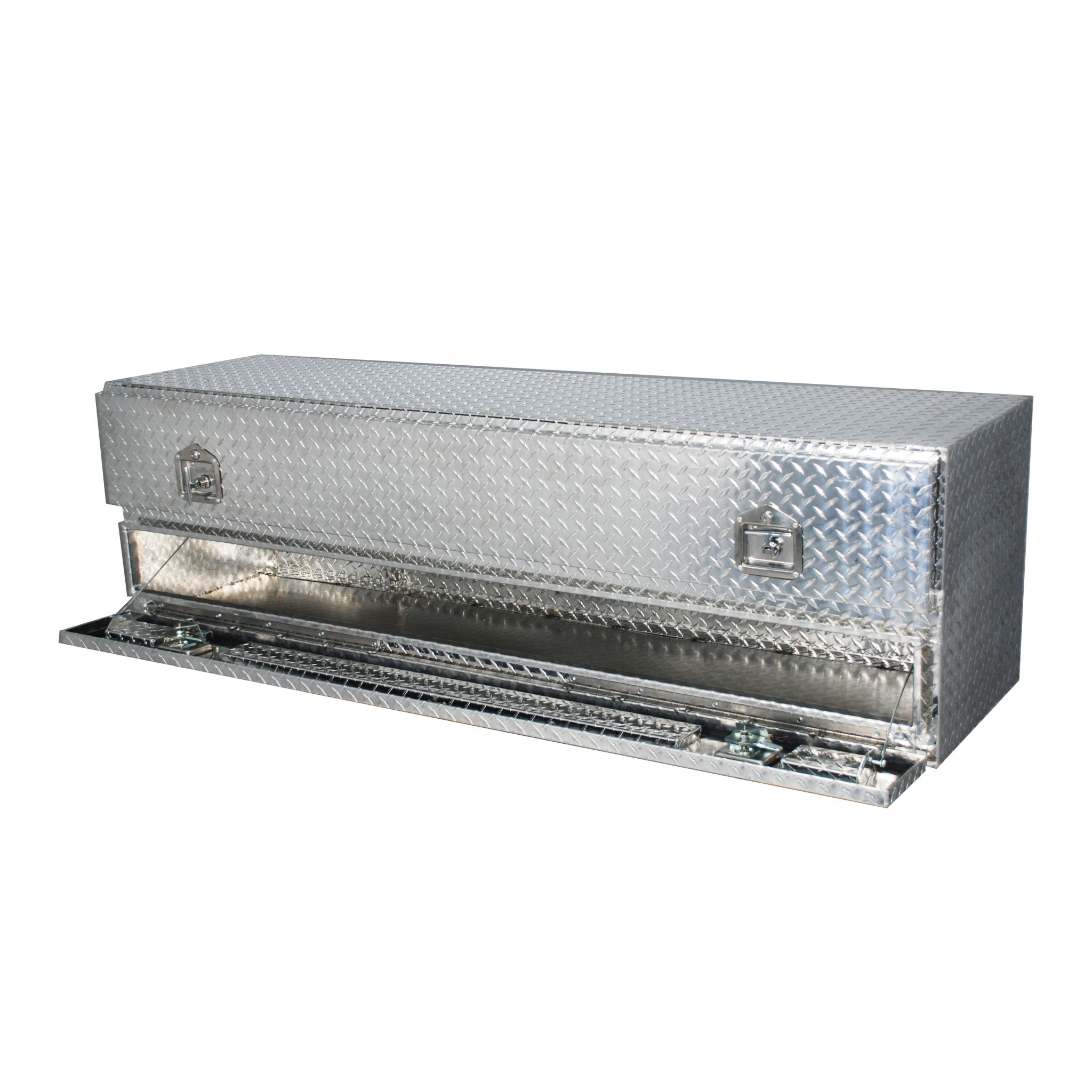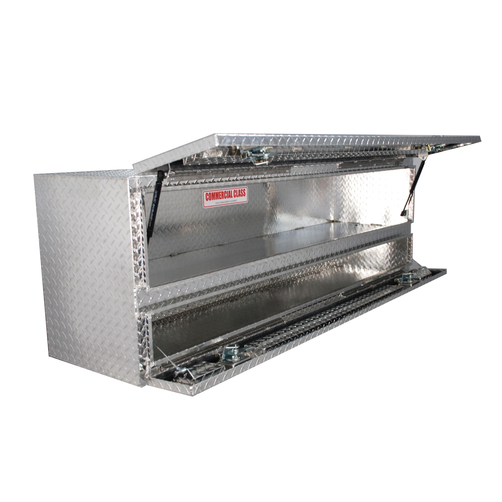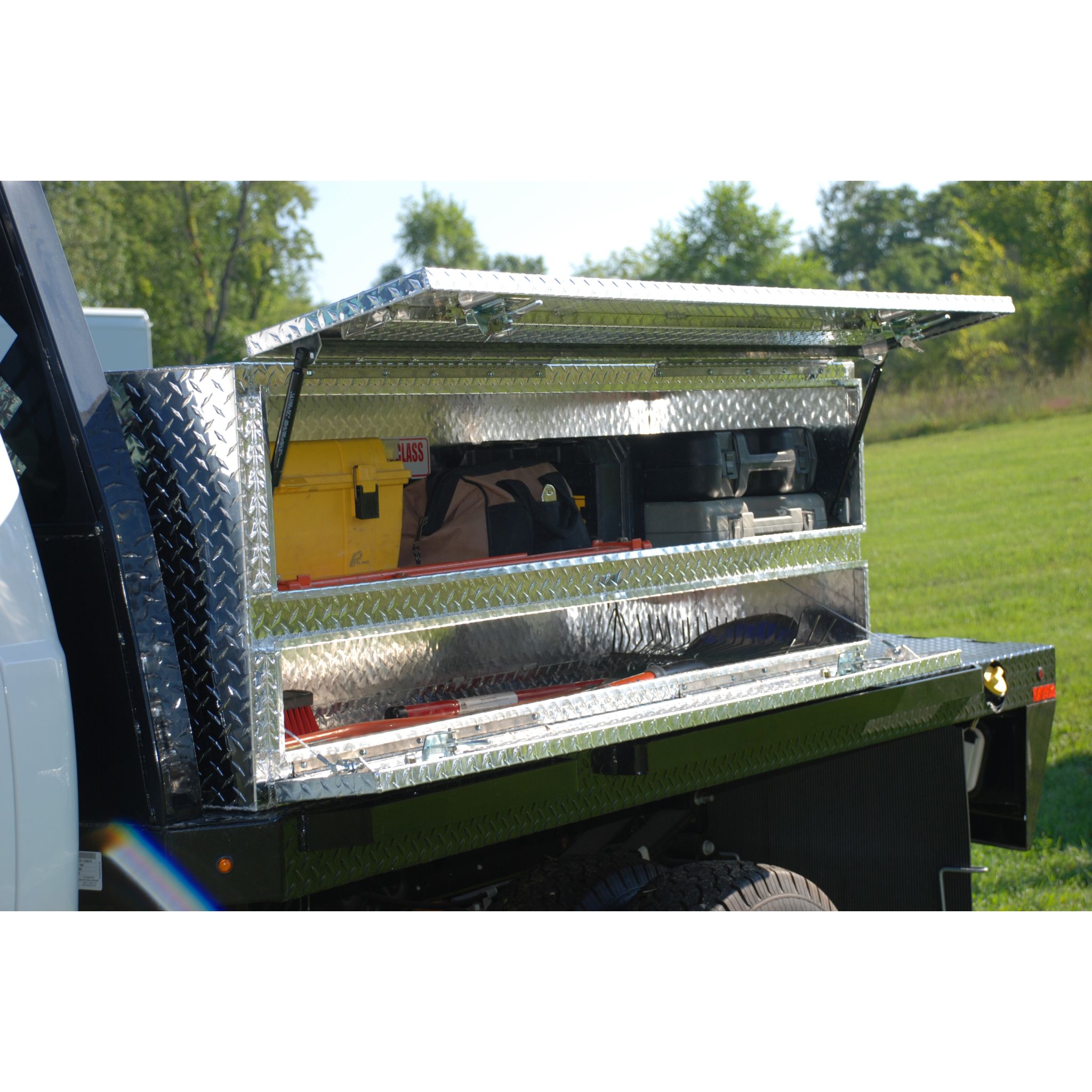 72"x20"x24" High Cap Stake Bed Contr TopSider w/Doors Comm Class for Flat/Stake Bed; Extra Deep/Tall; Reinforced Top Shelf; HD Gas Shocks; Bottom Compartment w/Dropdown Door; .063" Aluminum Diamond Tread; Stainless Folding Locking T Handles
