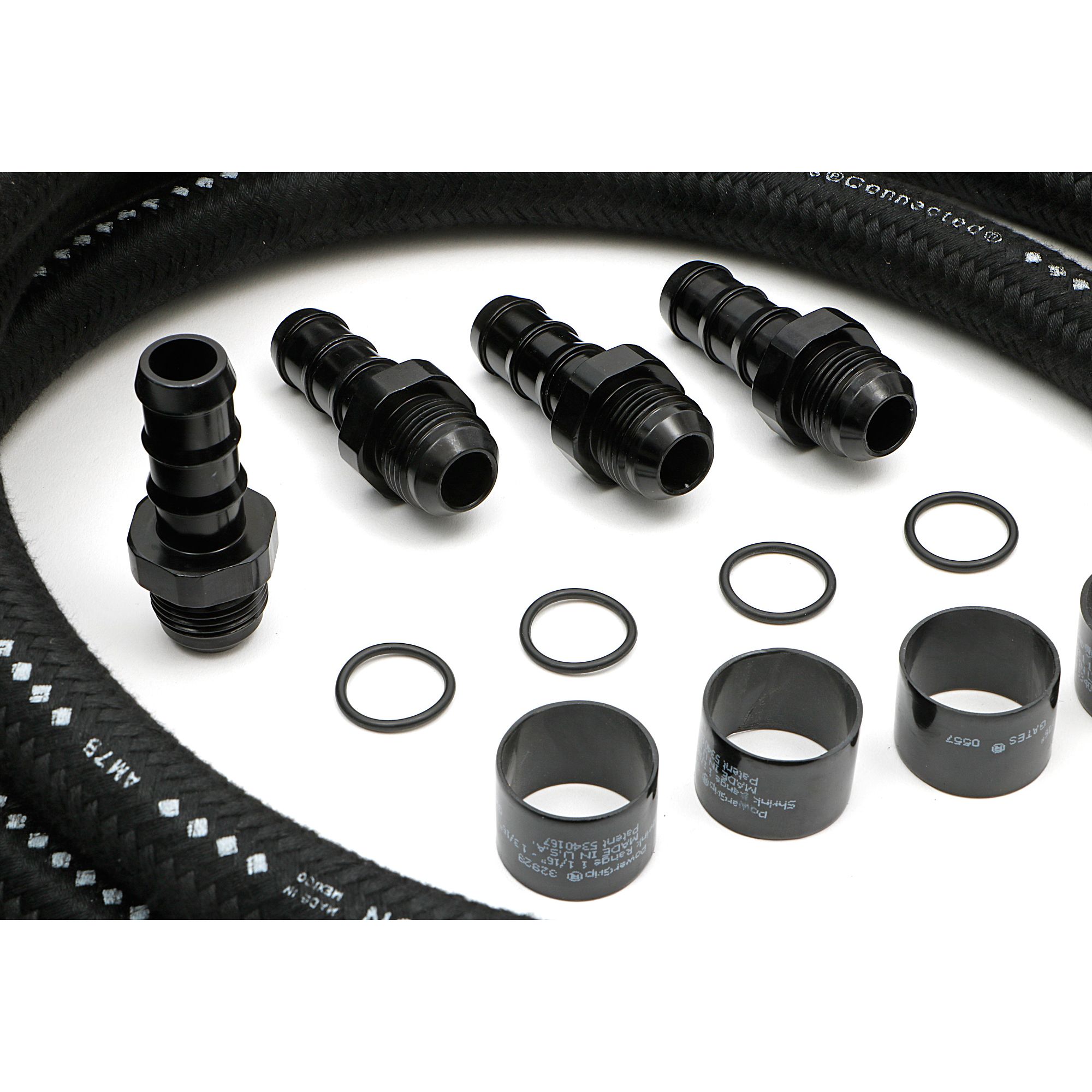Package Contents: 2 Braided hoses, 4 Anodized fittings, 4 O-rings, 4 high strength hose ferules