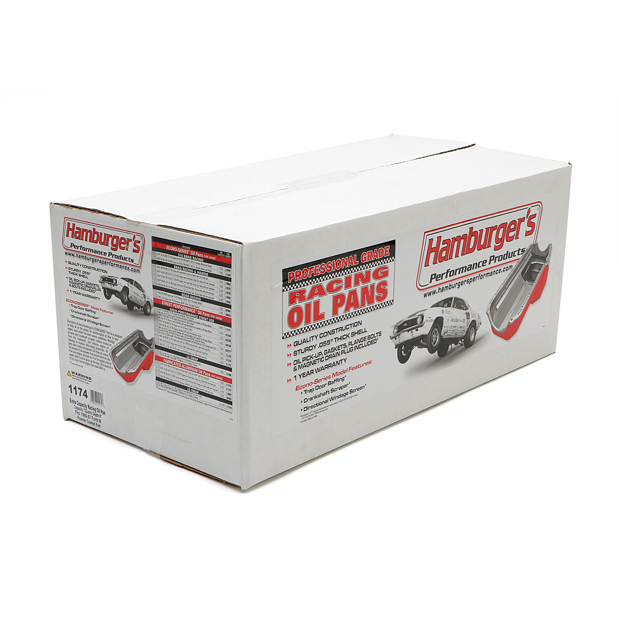 This STREET PERFORMANCE oil pan, from Hamburger's Performance, fits 1965-87 351W SB Ford engines in most Ford passenger vehicles and 2WD trucks that use a front sump oil pan. Its all-steel construction makes it strong, lightweight and affordably priced. The pan measures 9" deep and has kickouts with a 12-1/2" overall width. The pan's oil capacity is 7 quarts. The pan includes an oil pan gasket set, and special oil pick-up that is compatible with stock oil pumps.