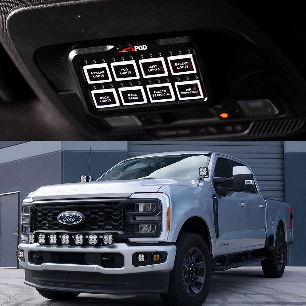 sPOD BantamX HD smart panel truck specific power management system for the 2023-on Ford F-250/350 Super Duty has been engineered to take control, giving you that factory appearance and installation to your sPOD control panels. Designed specifically to integrate the sPOD control panel into your cabin, providing a safe place to access all your controls within arm’s reach. With 8 circuits of power each at 30A per channel, 100A total, the connect-and-go systems have been designed to fit seamlessly into your vehicle to fit your needs. The BantamX allows system scalability with the expansion of up to 32 channels controlled by one controller. Each system is equipped with built-in sPODConnect Bluetooth technology, allowing users to program from any iOS or Android device via the sPOD app. With a wide range of programming options available, including output dimming, strobing, flashing, master-slave functions, memory, auto power-up, momentary settings, switch linking, input control and more. Backed by a 5-year* manufacturer warranty, sPOD allows simple and safe power management that is worry-free, allowing you to take control.