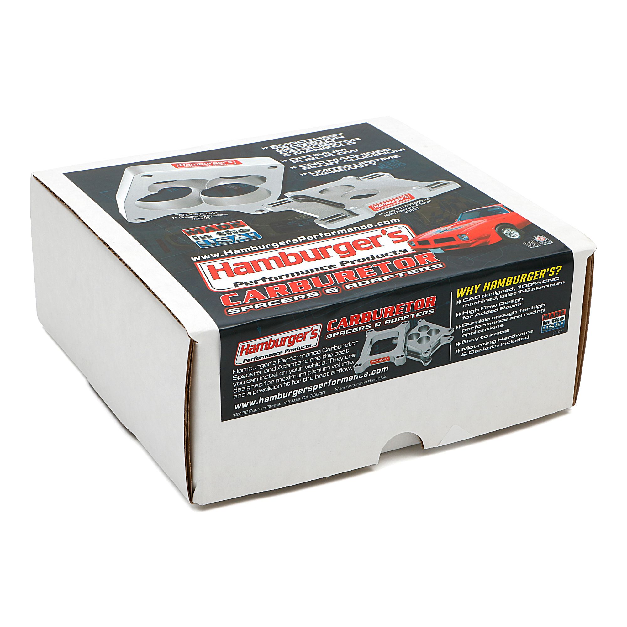 <p>It is no secret that tuners can alter their engine torque's sweet spot imply by increasing or decreasing the length plenum beneath the carburetor. To lengthen the plenum, simply install a carburetor spacer.</p><p>For years, carb spacers have mainly been available in 1" or 2" tall varieties. This 4 barrel carb spacer measures 1-1/2" tall, and offers builders and drag aracers another level of tunability.</p><p>Hamburger's precision CNC machines this spacer in their Whittier, California manufacturing facilty using 6061-T6 aluminum, then giving a durable clear anoziding to protect it from the harsh engine bay elements. Hamburger's includes all the necessary gaskets and longer mounting hardware to accomodate the taller carburetor position. The spacer is designed with 8 mounting holes so it can be used with both Holley and AFB 4 bbl carburetors on a standard 4 barrel intake manifold. This model has a straight port design to provide a smooth transition between the 4 barrel carb and intake manifold. This spacer is backed by a limited lifetime warranty!</P>