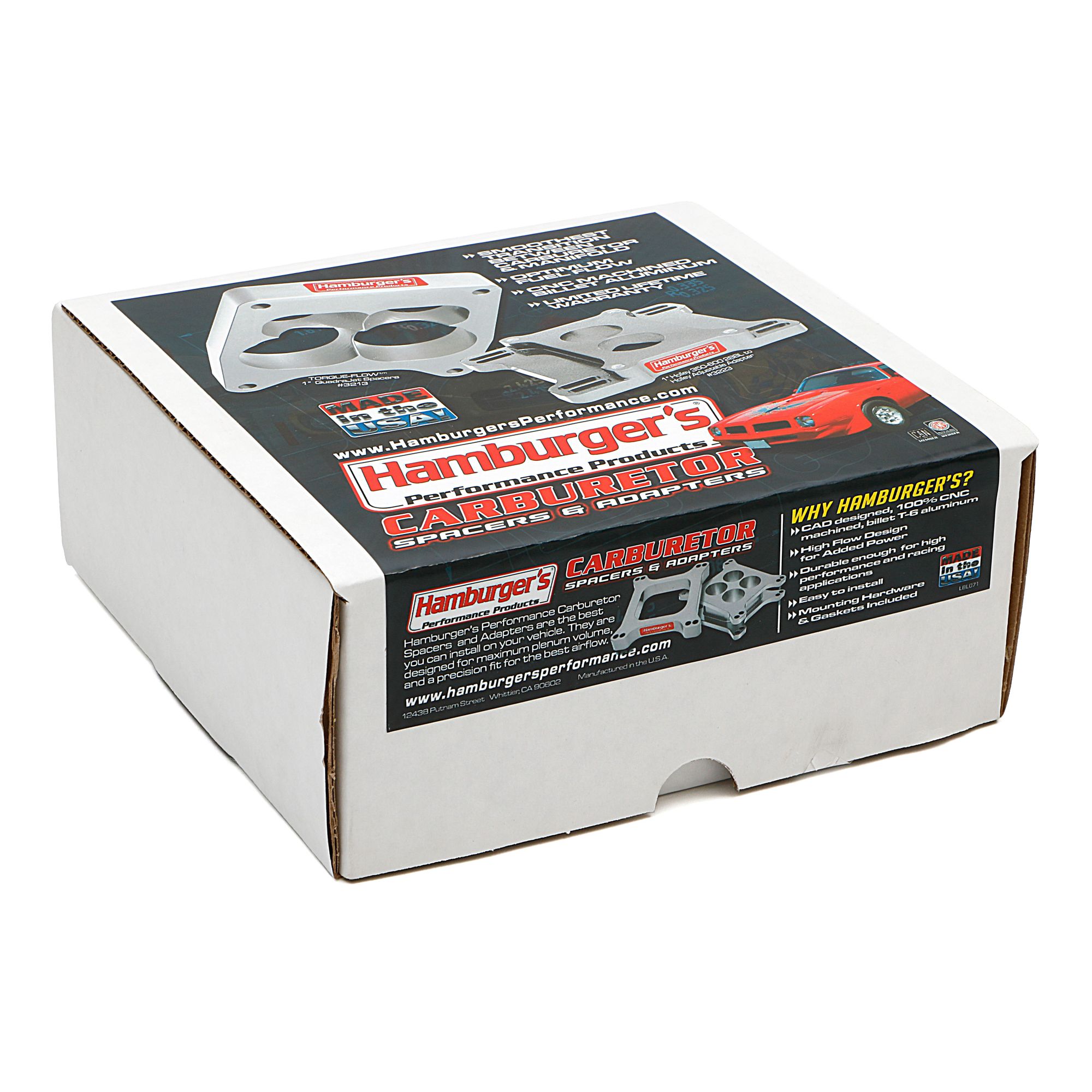 <p>It is no secret that tuners can alter their engine torque's sweet spot imply by increasing or decreasing the length plenum beneath the carburetor. To lengthen the plenum, simply install a carburetor spacer. For years, carb spacers have mainly been available in 1" or 2" tall varieties.</p><p>This spacer has been designed specifically for use on DUAL PLANE intake manifolds. The left 2 left and 2 right plenums have been isolated, to ensure you maintain the integrity of the dual plane design. In addition to the 1-1/2" tall design offering builders and drag aracers another level of tunability, the special, tapered port design of this Torque-Flow carburetor spacer, provides the benefit of a venturi effect to increase intake speed and improve the spacer's ability to produce torque.</p><p>Hamburger's precision CNC machines this spacer in their Whittier, California manufacturing facilty using 6061-T6 aluminum, then giving a durable clear anoziding to protect it from the harsh engine bay elements. Hamburger's includes all the necessary gaskets and longer mounting hardware to accomodate the taller carburetor position. The spacer is designed with 8 mounting holes so it can be used with both Holley and AFB 4 bbl carburetors on a Dual-Plane, 4 barrel intake manifold. This spacer is backed by a limited lifetime warranty!</P><hr><h6><em><p style="color:grey;">Gaskets require slight modification for use with dual-plane applications.</em></p></h6><hr>