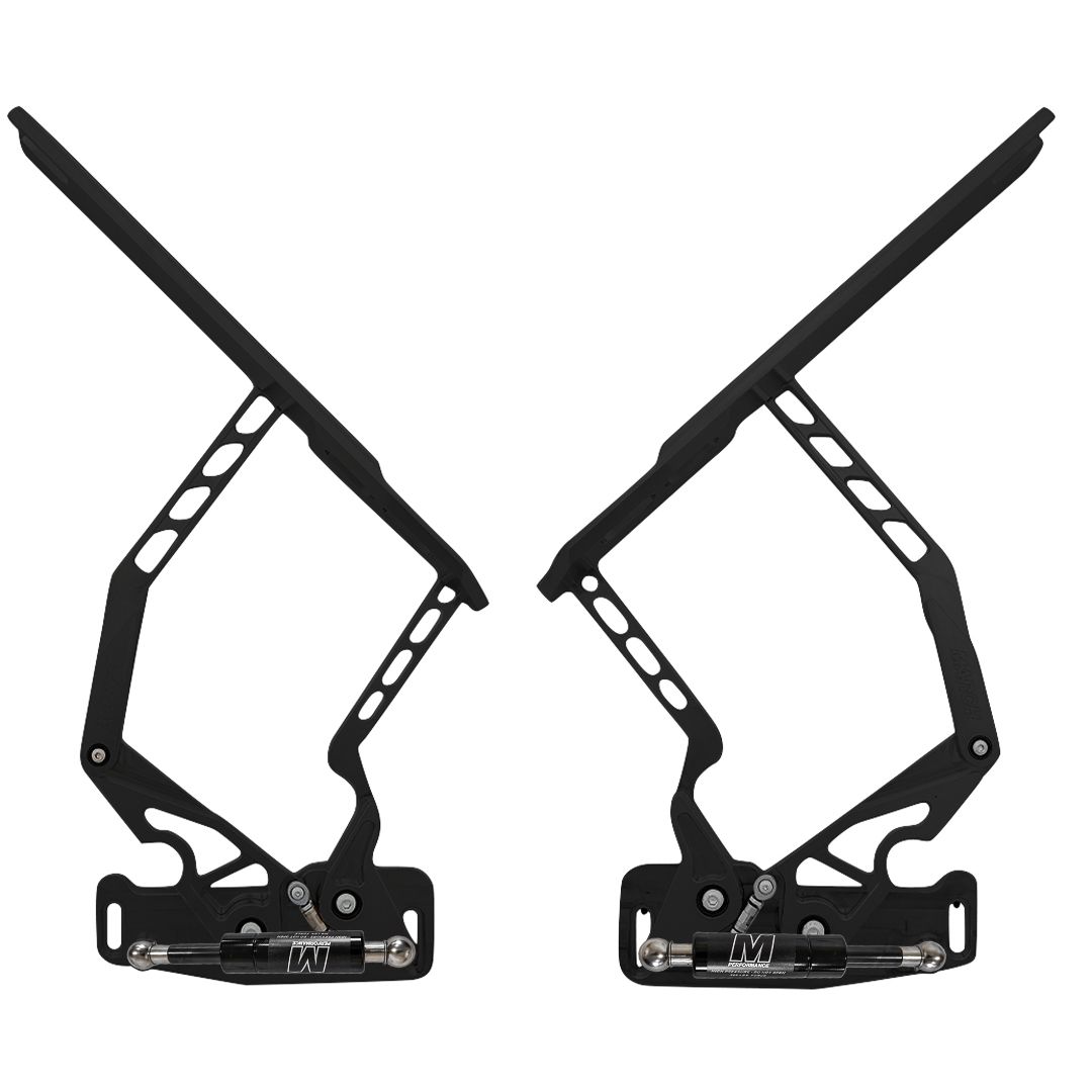 Hinges have 6 axis adjustablity. CAM button technology allows for easy side to side or angle adjustments of the hood. Micro adjustment utilizes internal set screws in the mounting block to keep it in place when the bolts are loosened, allowing for simple height changes. Stainless steel adjustment rods allow for rear height adjustments in small increments to achive perfect hood gap. Stainless steel gas struts are force matched to hood type for ease in opening and closing of the hood. Increased hood opening area allows for easier maintenance or the ability to showcase more of the engine compartment.