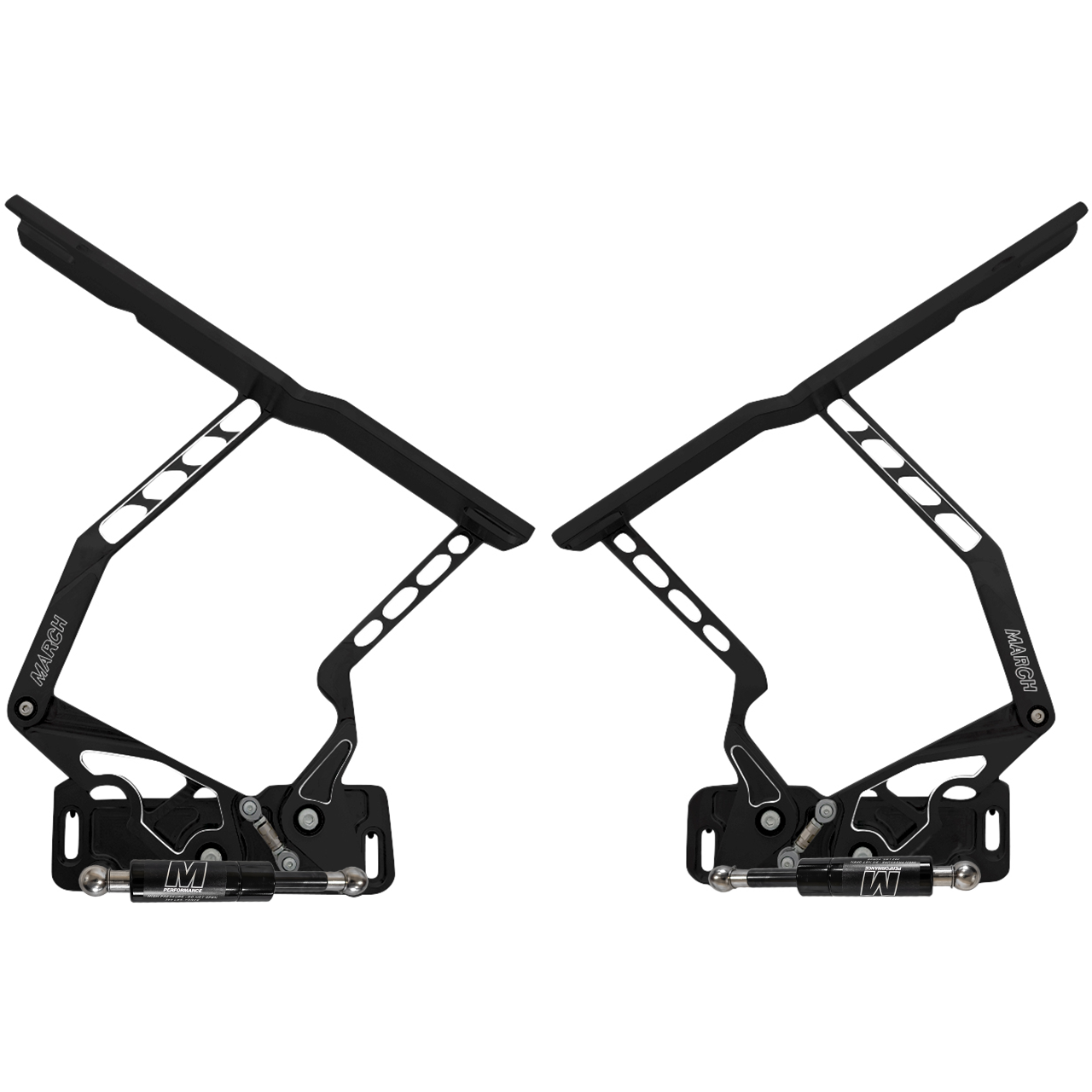 Hinges have 6 axis adjustability. CAM button technology allows for easy side to side or angle adjustments of the hood. Micro adjustment utilizes internal set screws in the mounting block to keep it in place when the bolts are loosened, allowing for simple height changes. Stainless steel adjustment rods allow for rear height adjustments in small increments to achieve perfect hood gap. Stainless steel gas struts are force matched to hood type for ease in opening and closing of the hood. Increased hood opening area allows for easier maintenance or the ability to showcase more of the engine compartment.