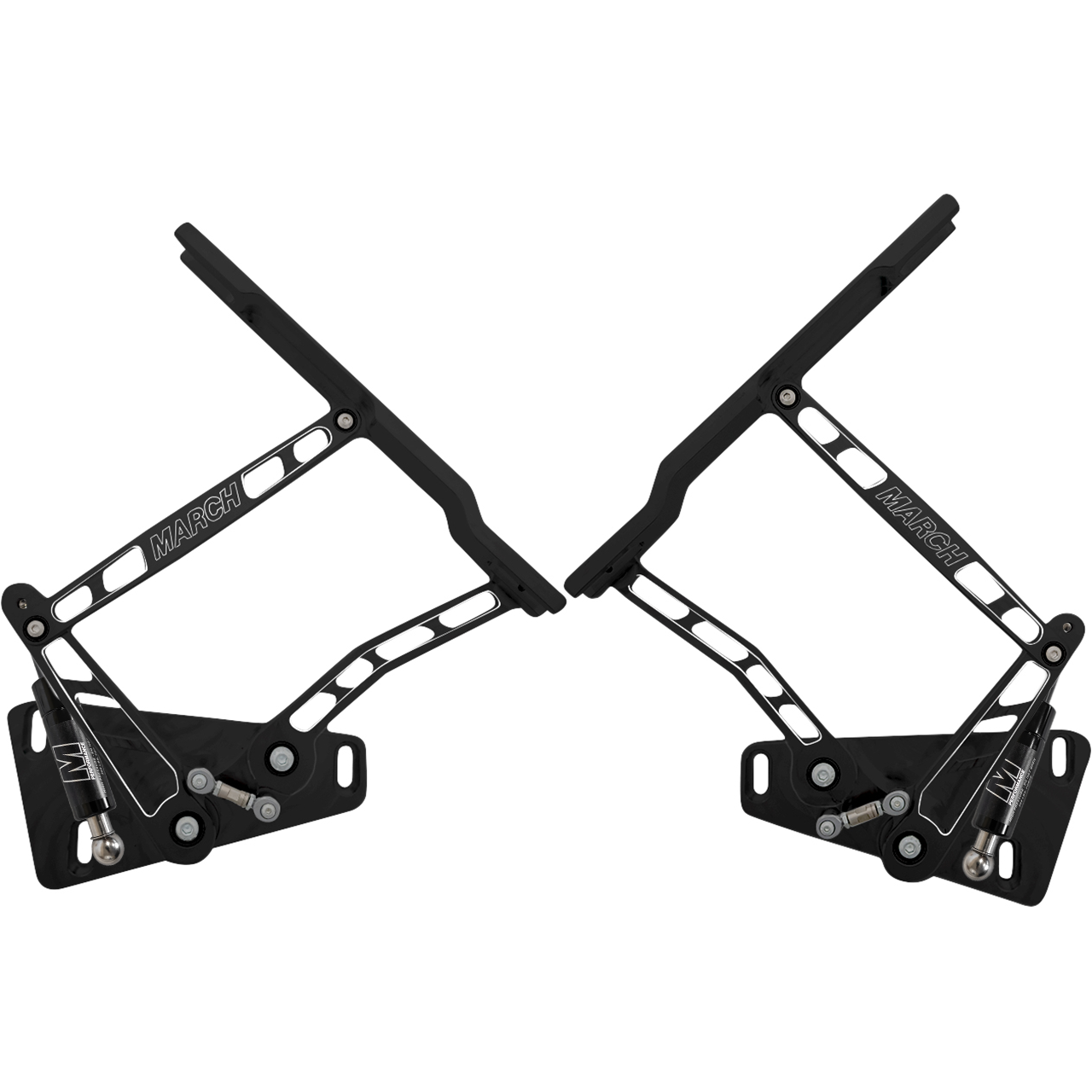 Hinges have 6 axis adjustability. CAM button technology allows for easy side to side or angle adjustments of the hood. Micro adjustment utilizes internal set screws in the mounting block to keep it in place when the bolts are loosened, allowing for simple height changes. Stainless steel adjustment rods allow for rear height adjustments in small increments to achieve perfect hood gap. Stainless steel gas struts are force matched to hood type for ease in opening and closing of the hood. Increased hood opening area allows for easier maintenance or the ability to showcase more of the engine compartment.