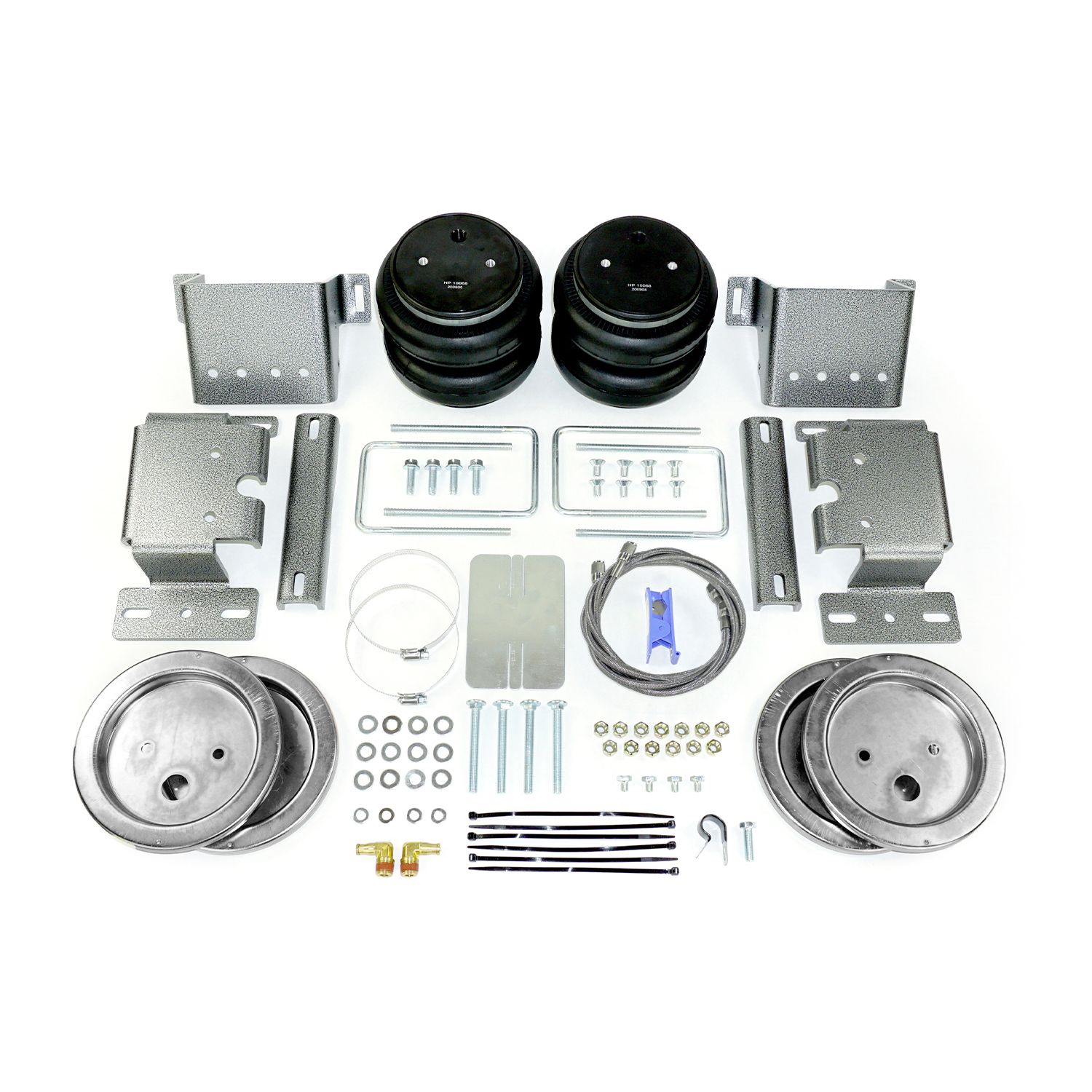 EACH KIT INCLUDES: 6ft Braided Stainless Steel Air Lines, Stainless Steel Air Spring Fittings, Stainless Steel Air Spring Mounting Hardware, Stainless Steel Schrader Valves, Stainless Steel Roll Plates, Two Air Springs, Everything required for install.