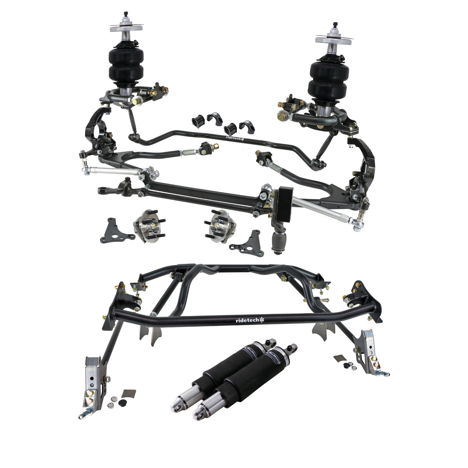 HQ Air Suspension System with hub spindles for 1961-1965 Falcon. Includes front and rear HQ Shockwaves, Front TruTurn System, spindles with S550 hubs, caliper brackets, Rear 4-Link and front sway bar.