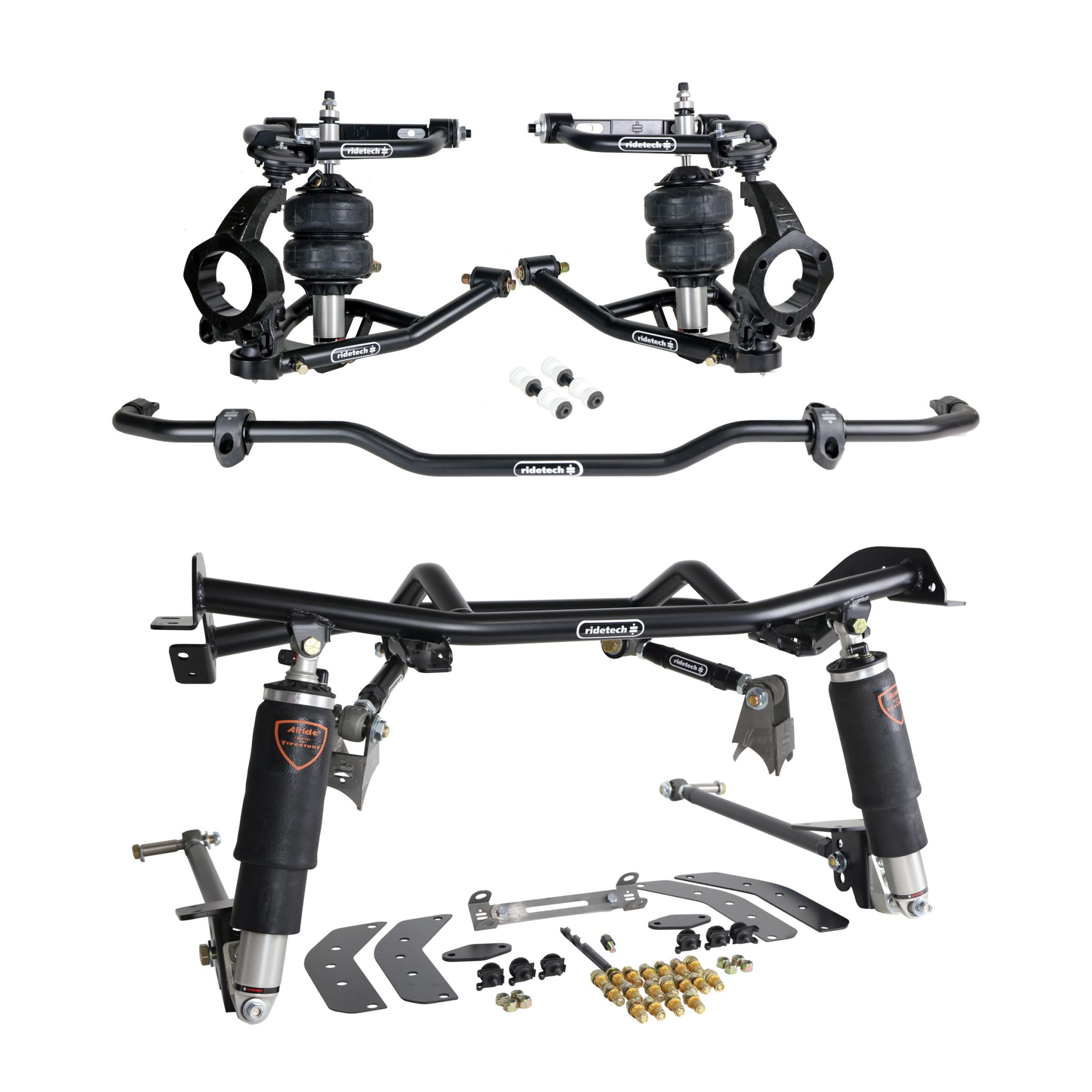 HQ Air Suspension System with hub spindles for 1967-1969 GM F-Body. Includes front and rear HQ Shockwaves, upper and lower StrongArms, Corvette hub spindles with caliper brackets, Bolt-On 4-Link with double adj. bars and front sway bar.