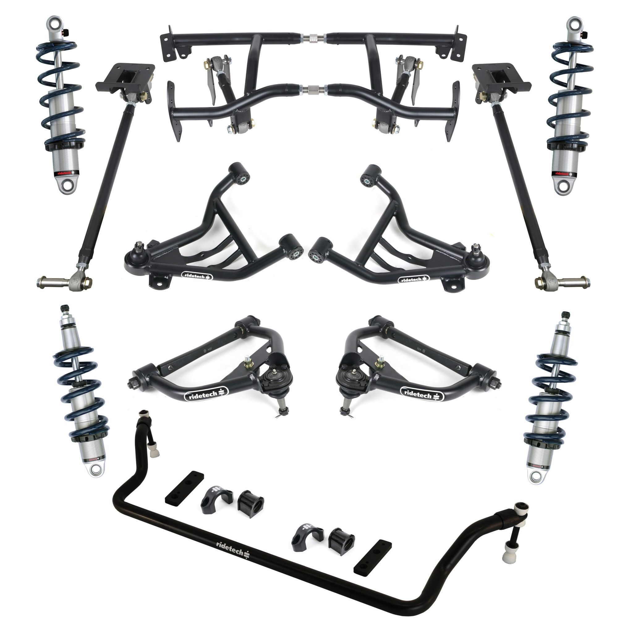 HQ Coil-Over System for 1970-1981 GM F-Body. Includes front and rear HQ Coil-Overs, front upper and lower StrongArms, Bolt-On 4-Link and front sway bar.