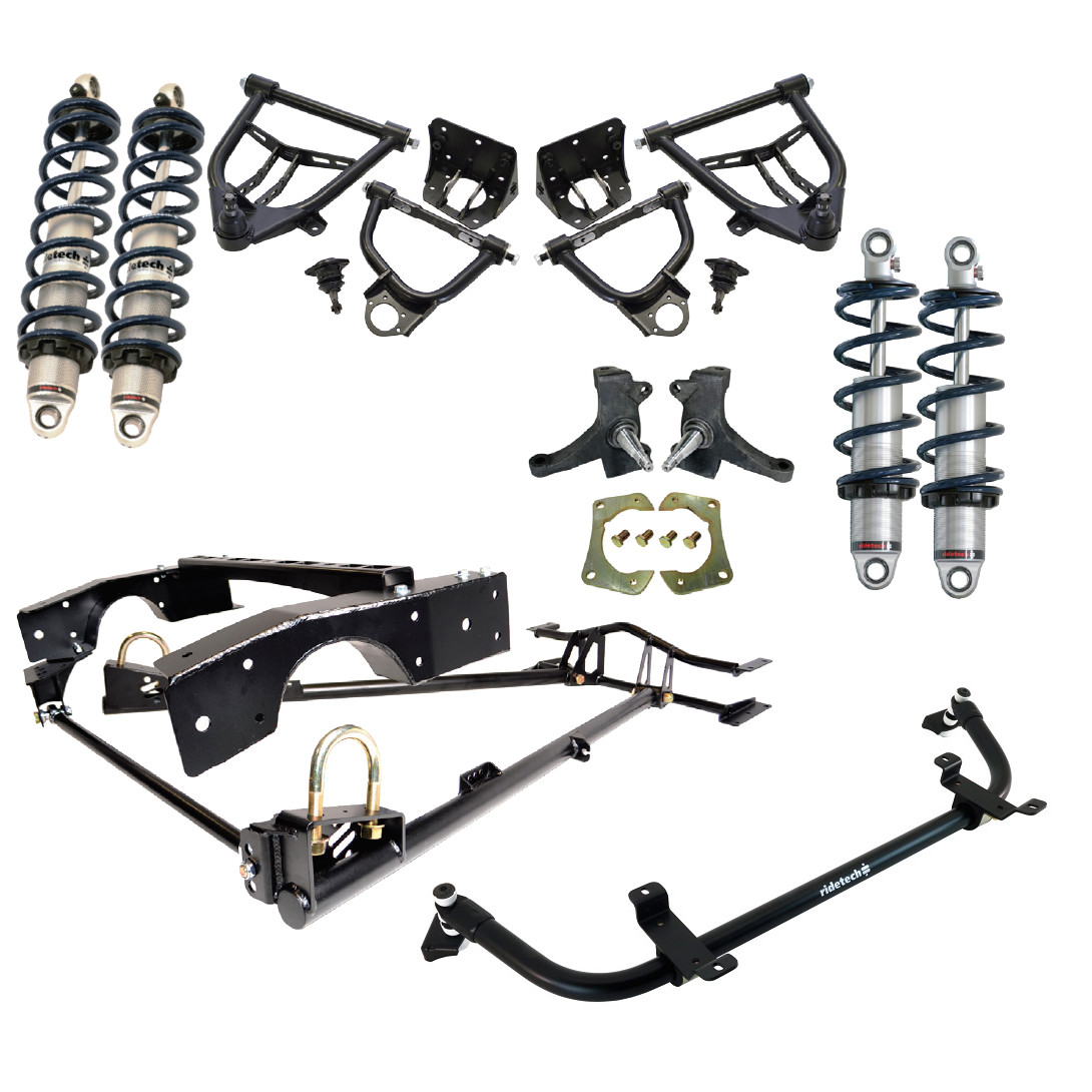 HQ Coil-Over System for 1971-1972 C10. Includes front and rear HQ Coil-Overs, front upper and lower StrongArms, Rear StrongArms, Drop Spindles and front sway bar.