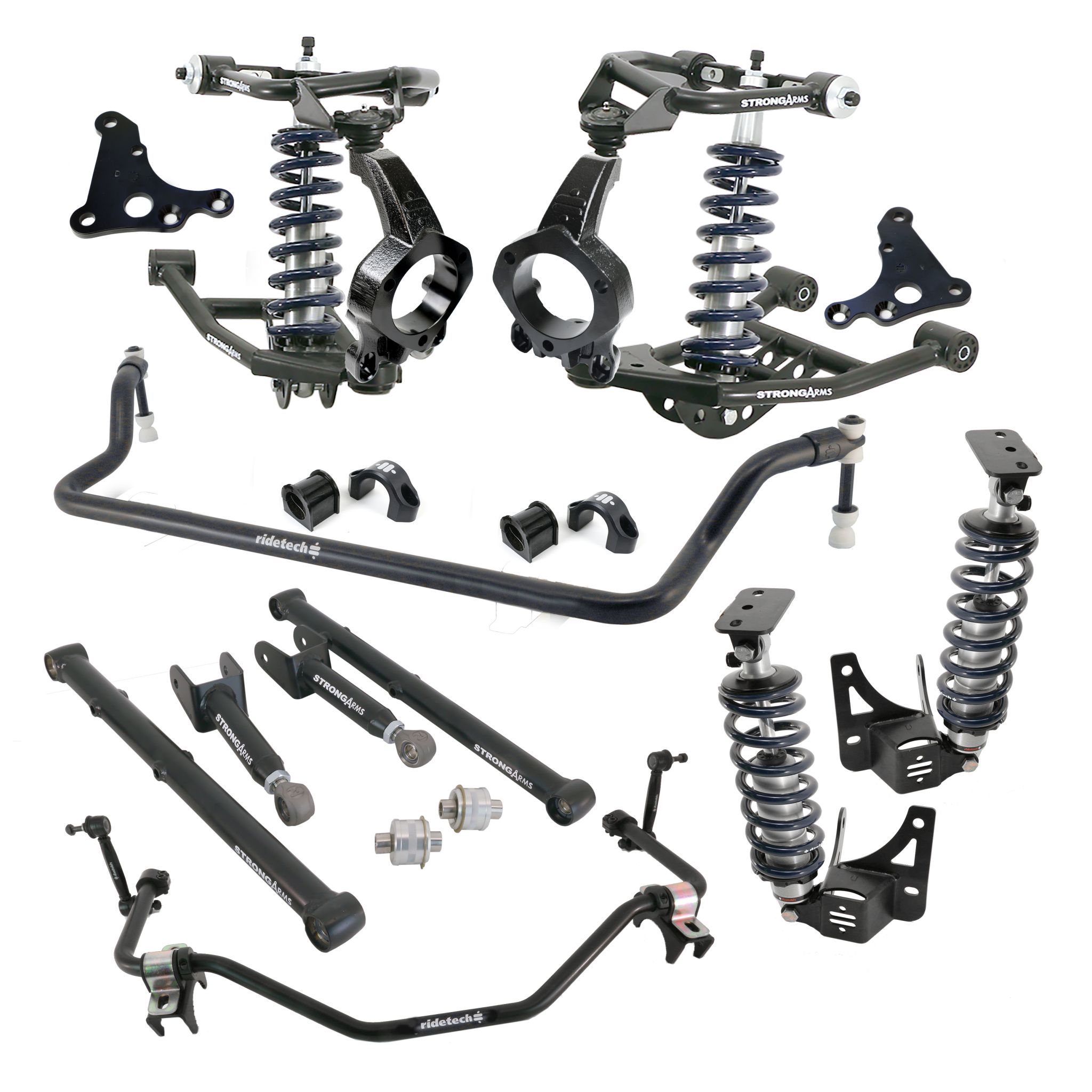 HQ Coil-Over System with hub spindles for 1964-1967 GM A-Body. Includes front and rear HQ Coil-Overs, front upper and lower StrongArms, rear upper and lower StrongArms, Corvette hub spindles with caliper brackets, front and rear sway bars.