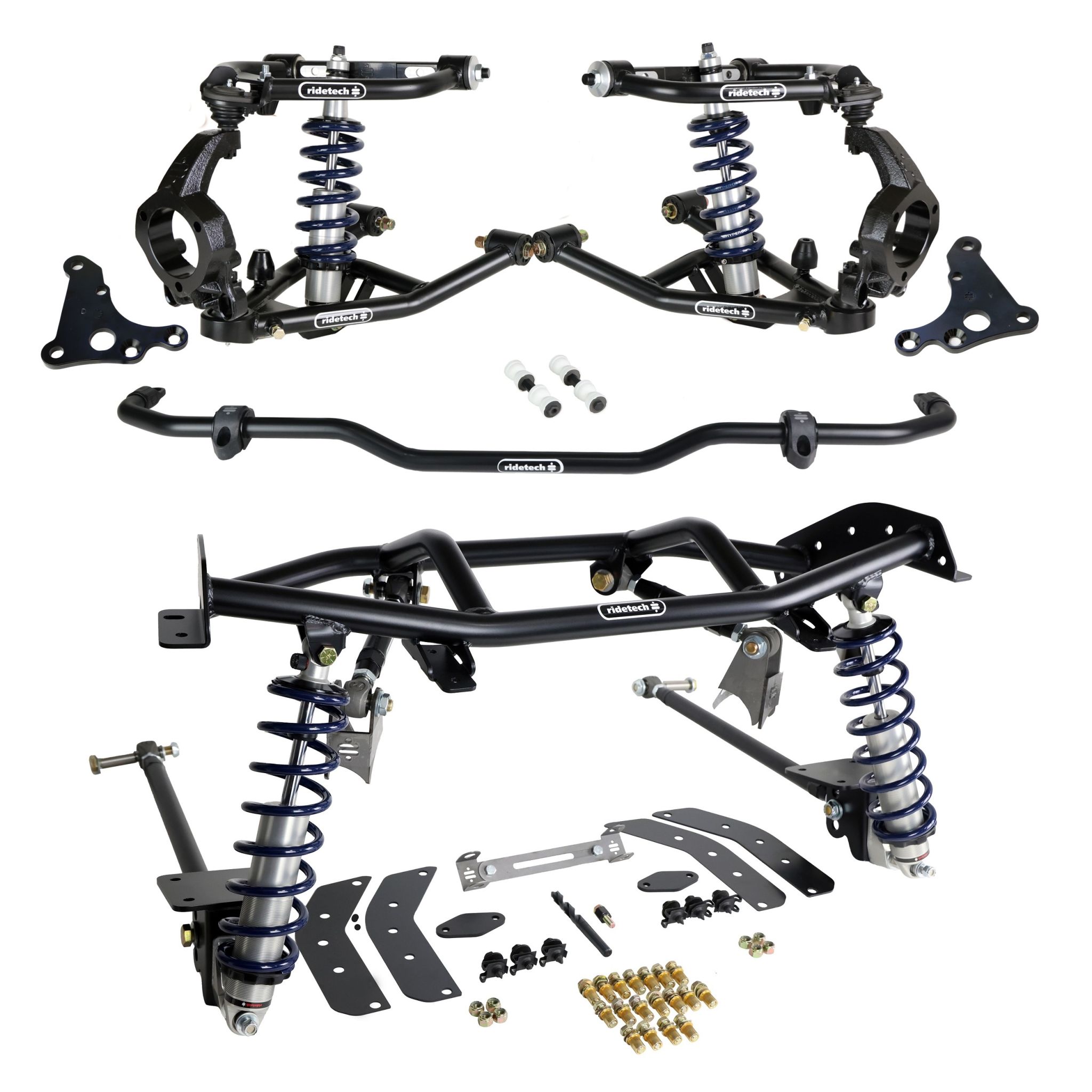 HQ Coil-Over System with hub spindles for 1967-1969 GM F-Body. Includes front and rear HQ Coil-Overs, front upper and lower StrongArms, Corvette hub spindles with caliper brackets, Bolt-On 4-Link with double adj. bars and front sway bar.
