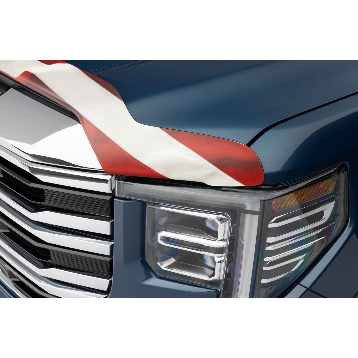 Road debris and bug splatter are just a part of life, but chips and scratches in your paint don't have to be. With Husky Liners(R) American Flag with Eagle Bug Shield, you get super durable protection in a contour-fit design that not only deflects road debris, it reflects your values. The bright, high-definition American flag design is available with a bald eagle and is constructed with robust acrylic construction that stands up to impact, UV exposure, and other elements that can damage your paint job. The precision fitment hugs the contours of your truck's front end but sits just far enough away from the hood to allow easy cleaning. Proudly made in the USA with global materials.