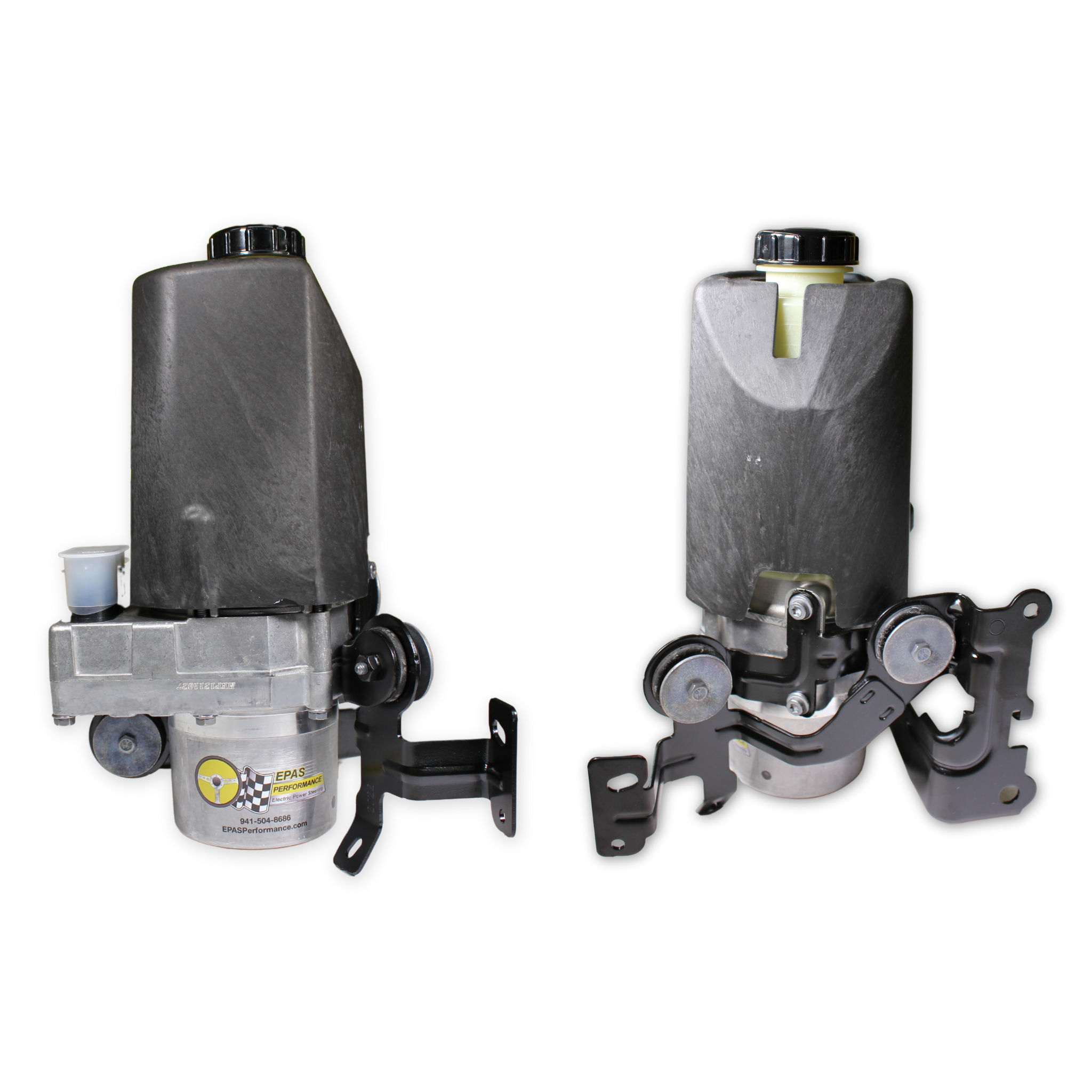 This system must be used with a power steering rack or power steering box. HOW IT WORKS: Our new system has a program that works with an angle sensor and CAN protocol. Our converter talks to the pump via the angle sensor, ramping up the systems pressure as needed. There is no noticeable delay or drop in pressure when input at the steering wheel is exerted.. Our system includes 6' of high-pressure sending hose, 6' of low pressure return hose and the power cords are 10' in length. An oil cooler can be added for racing applications. The wiring harness is essentially plug and play, and only requires a hot ignition source, and full battery power. The systems draw is anywhere between 1Amp to 45Amps, spending most of its time in the lower amp range. Maximum pressure of the unit is rated at 1900PSI @5GPM and the absolute maximum length of the pressure hose and return lines is 17'. The installation of this system should be done by a professional mechanic or a very knowledgeable amateur.