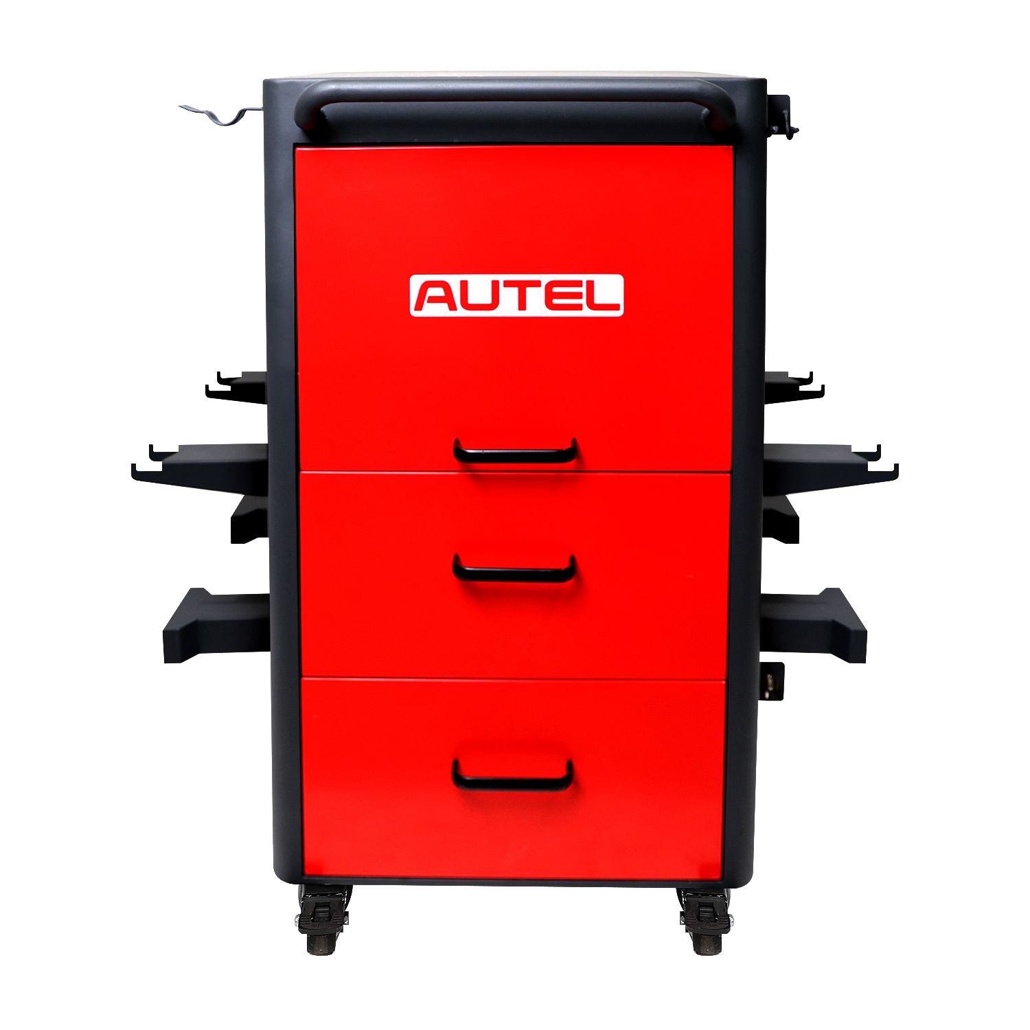 Metal storage cabinet with wheels for storage of IA900WA rim clamps, positioning targets, brake pedal depressor, steering wheel lock, and wheel chocks. Two drawers and one large center storage space with pull-up door and slide out tray. Includes one-year limited warranty.