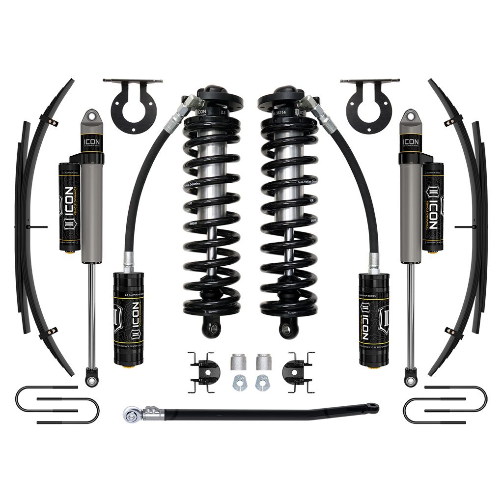 The ICON 2.5-3” coilover conversion suspension system is a great way to lift your 4WD 2008-2010 Ford F-250/F-350 Super Duty while improving ride quality and performance. This upgraded Stage 3 system is great for towing, rough construction site terrains, and country dirt roads all while keeping a smooth highway feel. ICON's Stage 3 System is comprised of 2.5 Series remote reservoir coilovers that are adjustable from 2.5-3” of front lift over stock, adjustable front track bar with massive FK rod end, alignment cams for adding caster, rear leaf spring expansion packs with blocks and U-bolts for a more compliant ride and reduced axle wrap, and ICON 2.5 Aluminum Series piggyback reservoir rear shocks. ICON 2.5 Series remote and piggyback reservoirs ensure optimum performance by increasing the duration of consistent damping regardless of situation, keeping the shocks at a cooler operating temperature during heavy use. With the endless hours ICON has spent testing and tuning our suspension components and shocks as a complete package, you can rest assured you have the best suspension solution on the market.