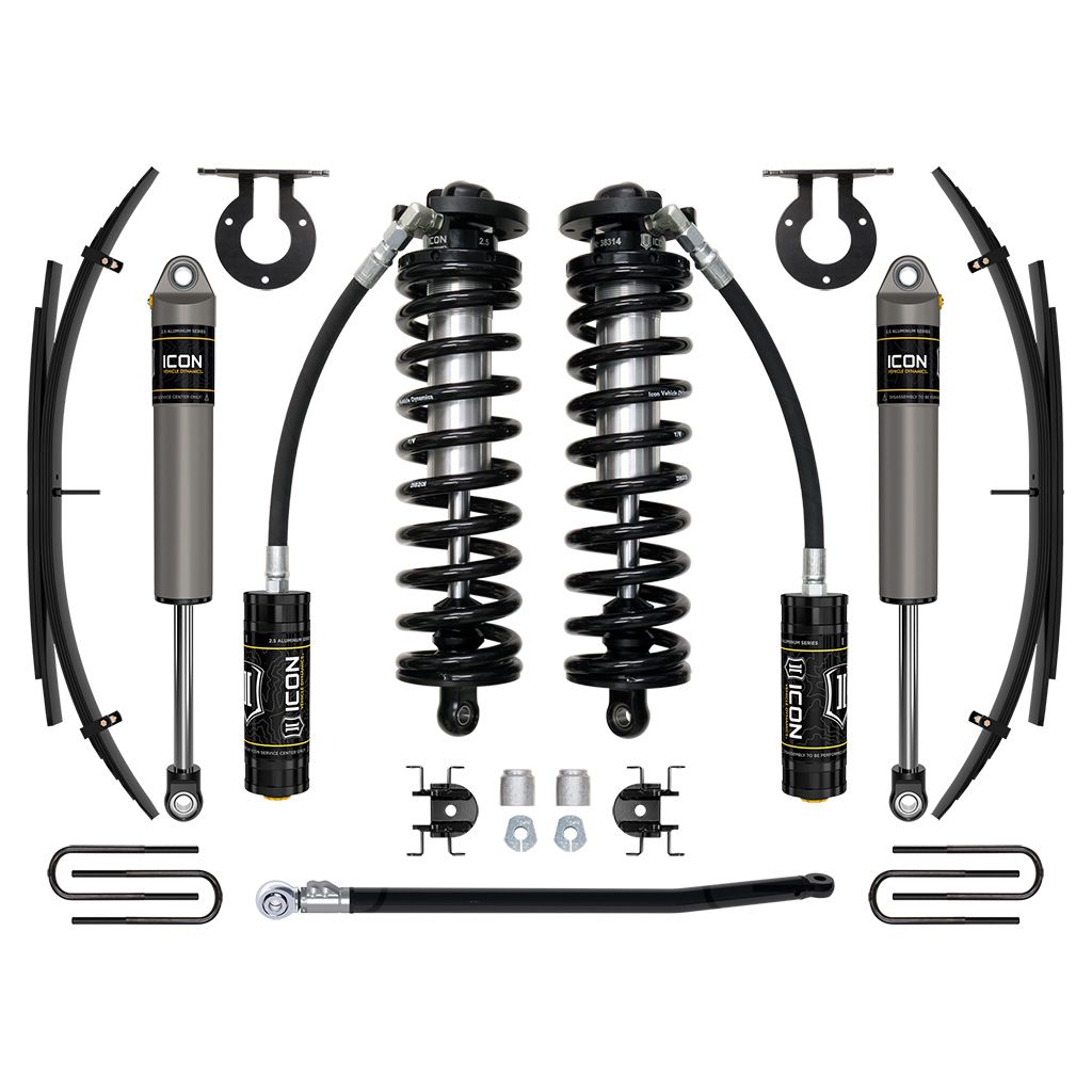 The ICON 2.5-3” coilover conversion suspension system is a great way to lift your 4WD 2011-2016 Ford F-250/F-350 Super Duty while improving ride quality and performance. This upgraded Stage 2 system is great for towing, rough construction site terrains, and country dirt roads all while keeping a smooth highway feel. ICON's Stage 2 System is comprised of 2.5 Series remote reservoir coilovers that are adjustable from 2.5-3” of front lift over stock, adjustable front track bar with massive FK rod end, alignment cams for adding caster, rear leaf spring expansion packs with blocks and U-bolts for a more compliant ride and reduced axle wrap, and ICON 2.5 Aluminum Series internal reservoir rear shocks. With the endless hours ICON has spent testing and tuning our suspension components and shocks as a complete package, you can rest assured you have the best suspension solution on the market.